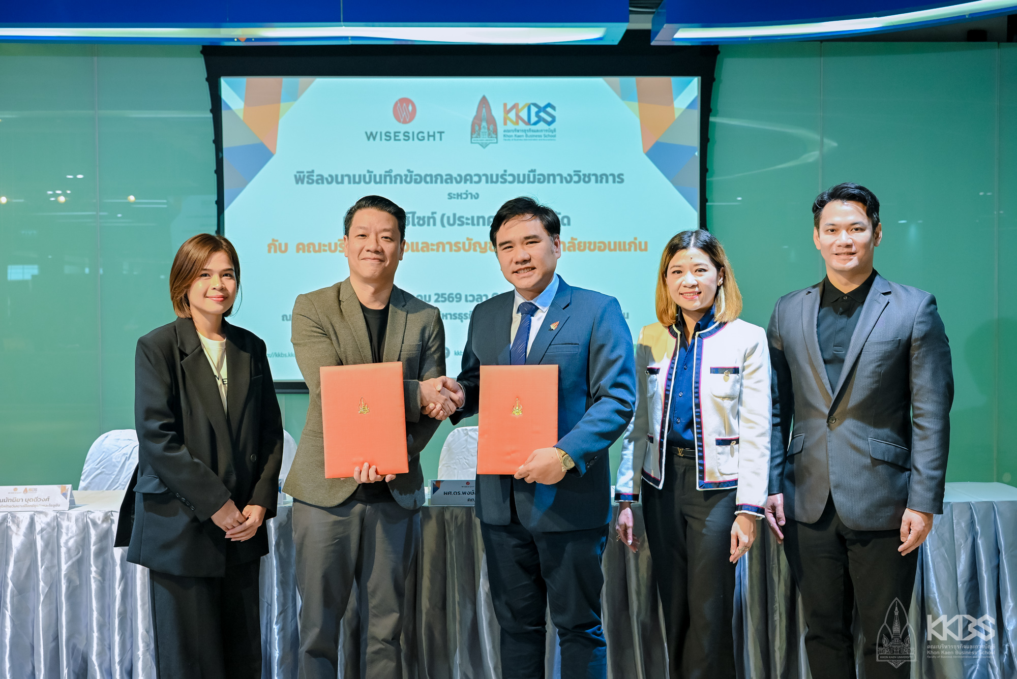 On 13 March 2026, the Faculty of Business Administration and Accountancy, Khon Kaen University (KKBS), held a Memorandum of Understanding (MOU) signing ceremony with Wisesight (Thailand) Co., Ltd. The agreement aims to foster collaboration in education, curriculum development, and the enhancement of skills essential for the digital business era. The ceremony was honoured by the presence of executives from both organisations, including Assistant Professor Pongsutti Phuensane, Ph.D., Dean of the Faculty of Business Administration and Accountancy; Dr. Pongpan Shattathip, Associate Dean for Industrial Relations and Sustainability; and Narissara Palusuk, Ph.D., Associate Dean for Administration and Corporate Image. Representing Wisesight were Mr. Kla Tangsuwan, Chief Executive Officer, and Ms. Mattaniya Buddiwong, Senior Business and Solution Analyst. The event took place at the Wang Lert Room, Faculty of Business Administration and Accountancy, Khon Kaen University.