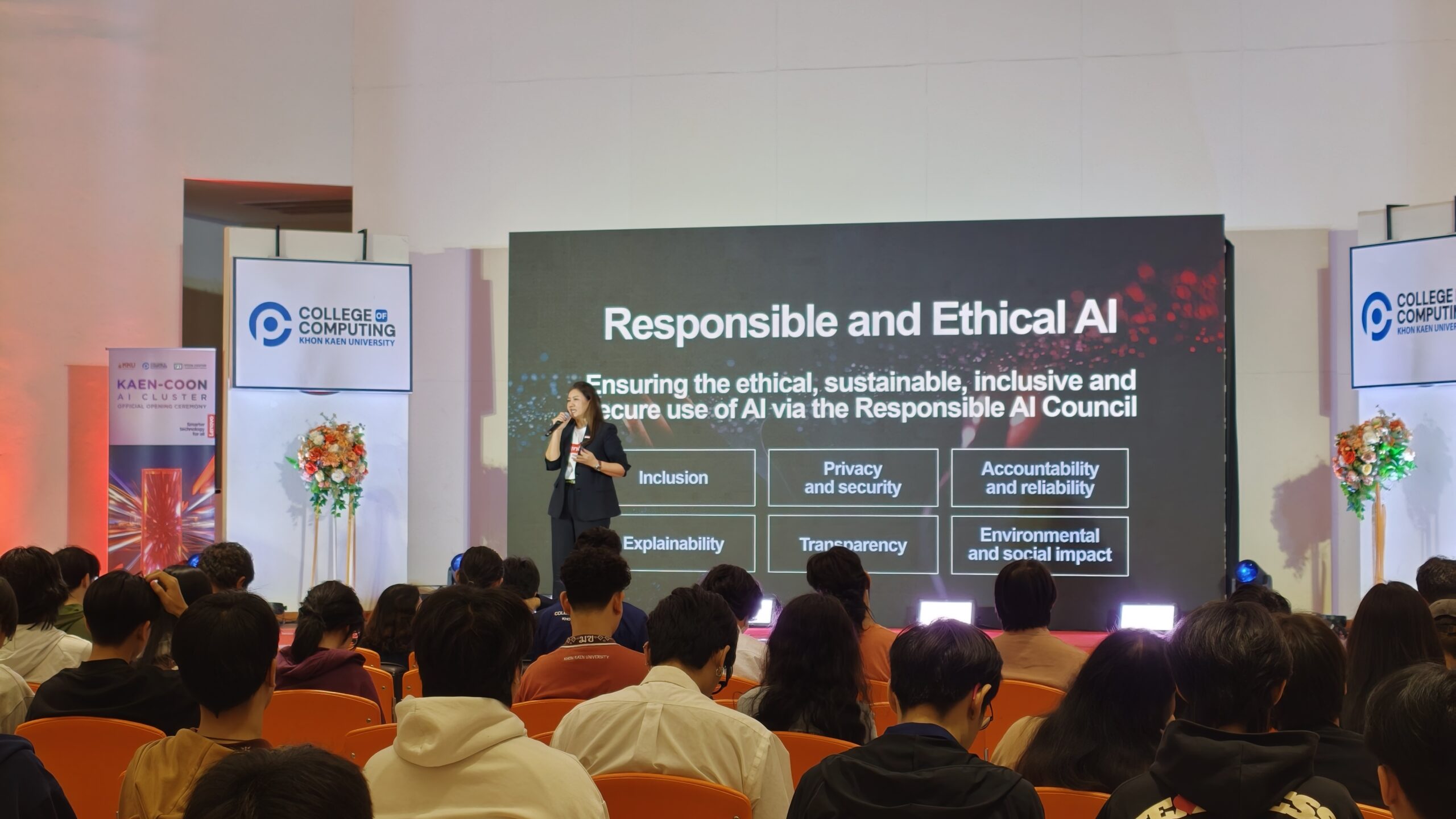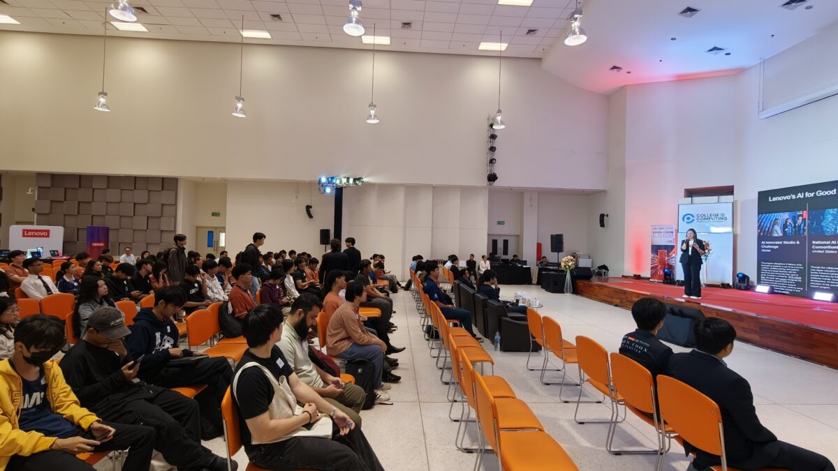 The ceremony was officiated by Associate Professor Sirapat Chiewchanwattana, Ph.D., Dean of the College of Computing, Khon Kaen University; Assistant Professor Praisan Padungweang, Ph.D., Chairman of the Bachelor of Science Programme in Artificial Intelligence; and Ms. Lertluck Kunlasutti, Country Manager of Lenovo (Thailand) Co., Ltd. The event attracted over 200 attendees, including faculty members, staff, students, and technology enthusiasts, at the Wittayawipas 1 Meeting Room, Wittayawipas Building (SC.09), College of Computing.