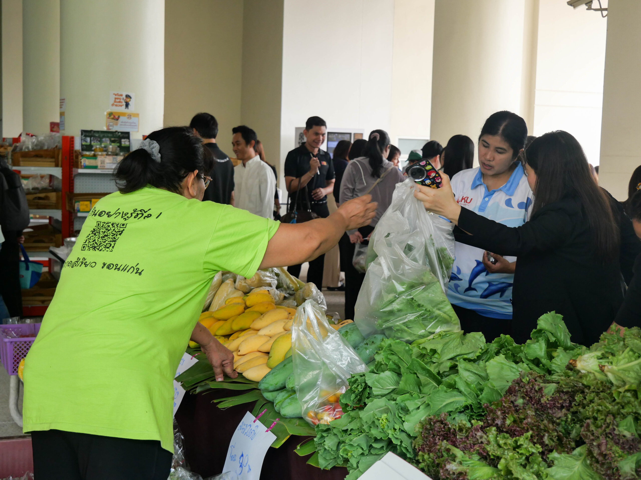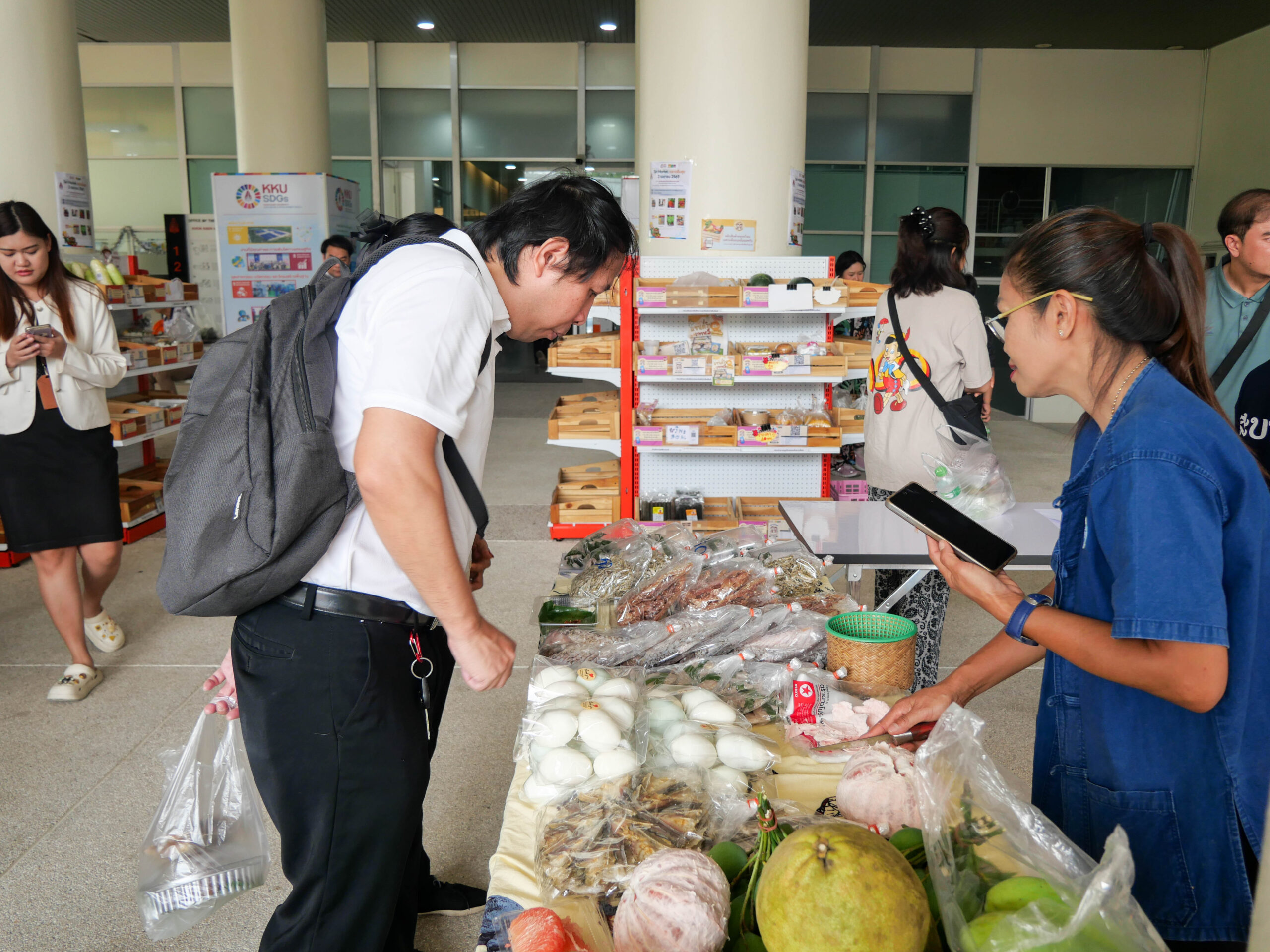 The market featured a lively atmosphere with a diverse range of vendors. Participants included community enterprise groups like Baan Photak, Chan Dao Salad Garden, and Mr. Dong Sausages, as well as sellers of local agricultural products. The Non Ku Smart City project, the KKU Senior Staff Club, and the Faculty of Science, which sold its “Sci Soil” compost and planting materials, were also present. Shoppers found a variety of fresh and processed foods, safe-produce vegetables, and agricultural products.