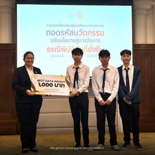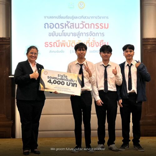 The team advisor, Assistant Professor Dr. Suriyanon Pholsim, stated that he would discuss pathways to advance these innovations with the College of Local Administration, following recommendations from the Department of Mineral Resources and the NIA. He also extended his gratitude to both COLA and CP for their support and for establishing the collaborative teaching and learning programme that merges their respective disciplines. He emphasised that the national recognition received by the students is a direct result of this interdisciplinary approach.