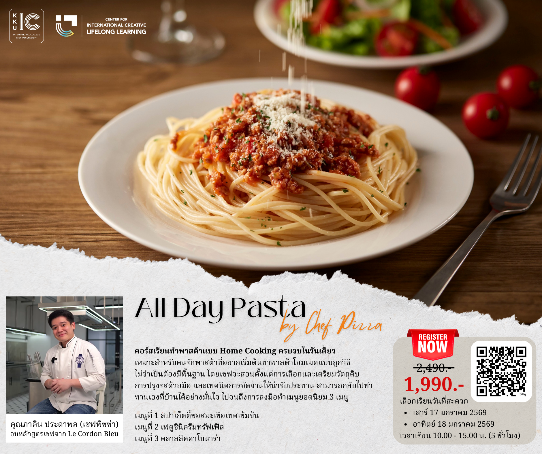 KKU staff members and interested participants are cordially invited to join “All Day Pasta by Chef Pizza,” a short course that combines learning, creativity, and enjoyment in one day. The program is organized by the Center for International Creative Lifelong Learning, KKU International College, in collaboration with Chef Pizza (Khun Parkin Pradaphon), a graduate of Le Cordon Bleu Dusit Culinary School and the owner of a fine dining restaurant.