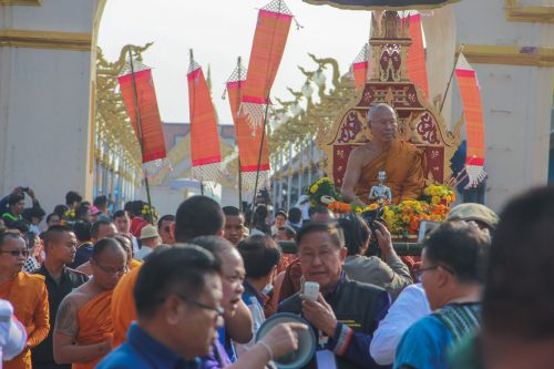 – ป้ายนำขบวน โดยผู้ถือป้ายลูกพระธาตุพนม หลานพระธรรม ข้าบั้งจุ้ม