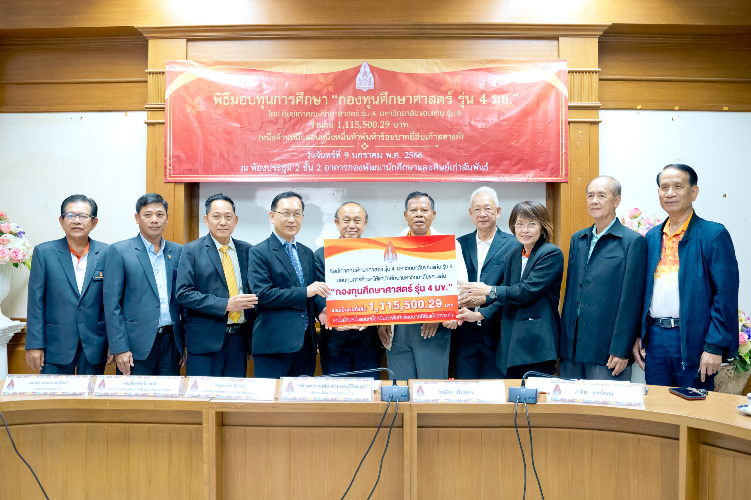 เมื่อวันที่ 9 มกราคม 2566 เวลา 15.00 น. รศ.นพ.ชาญชัย พานทองวิริยะกุล อธิการบดีมหาวิทยาลัยขอนแก่น รับมอบทุนการศึกษา ในพิธีมอบทุนการศึกษา กองทุนศึกษาศาสตร์ รุ่น 4 มข. โดยมี ผู้อำนวยการสมนึก ปิ่นทอง อดีตผู้อำนวยการกองกิจการนักศึกษา ประธานกองทุนศิษย์เก่าคณะศึกษาศาสตร์ รุ่น 4 เป็นประธานส่งมอบ และมีอธิการบดีเป็นประธานรับมอบทุนการศึกษาแก่มหาวิทยาลัยขอนแก่น เป็นเงินจำนวน 1,115,500.29 บาท ทั้งนี้ได้รับเกียรติจากผู้บริหารมหาวิทยาลัย และตัวแทนพี่ศิษยเก่าคณะศึกษาศาสตร์รุ่น 4 ร่วมงานจำนวนมาก ณ ห้องประชุม ชั้น 2 อาคารกองพัฒนานักศึกษาและศิษย์เก่าสัมพันธ์