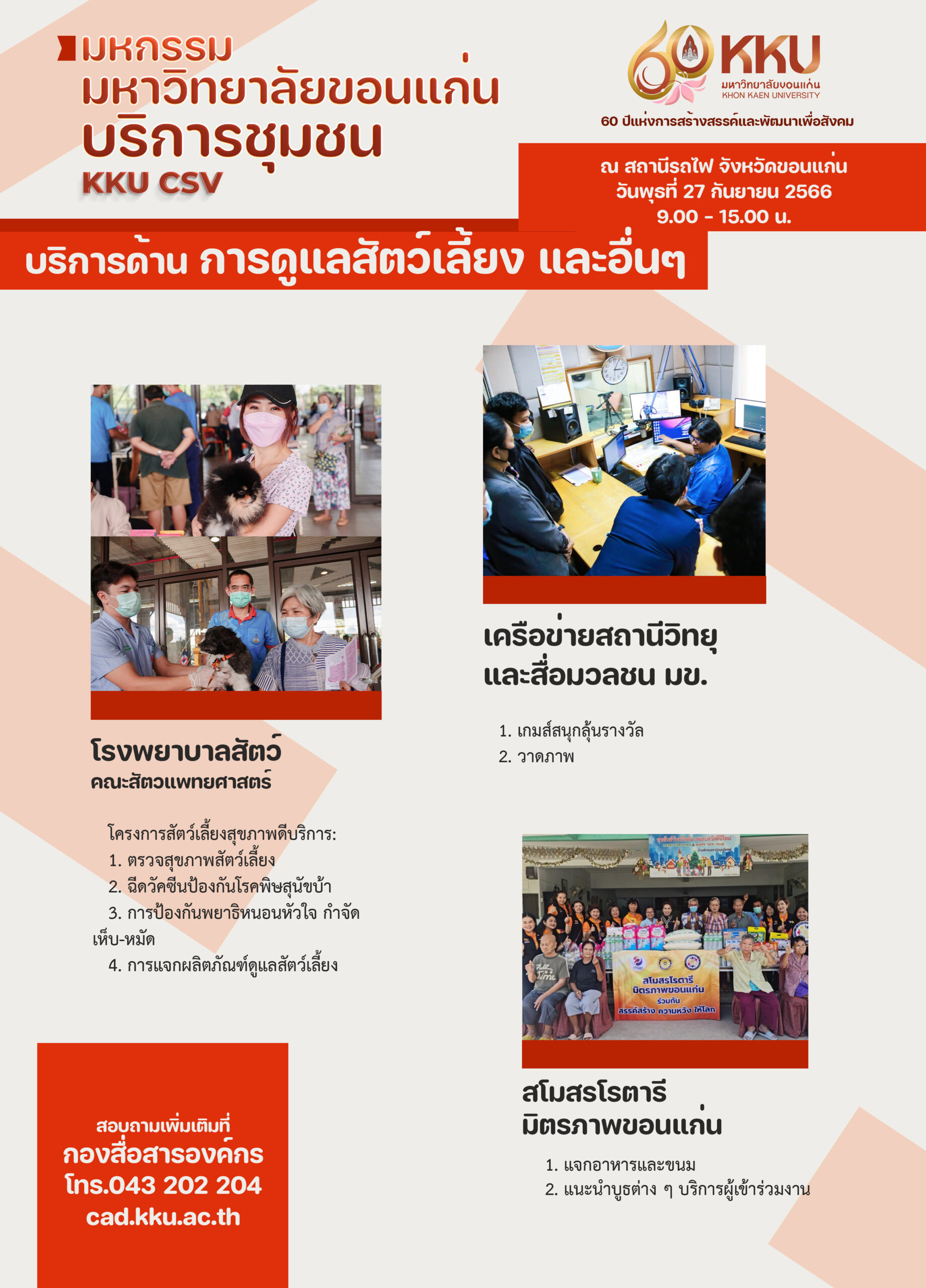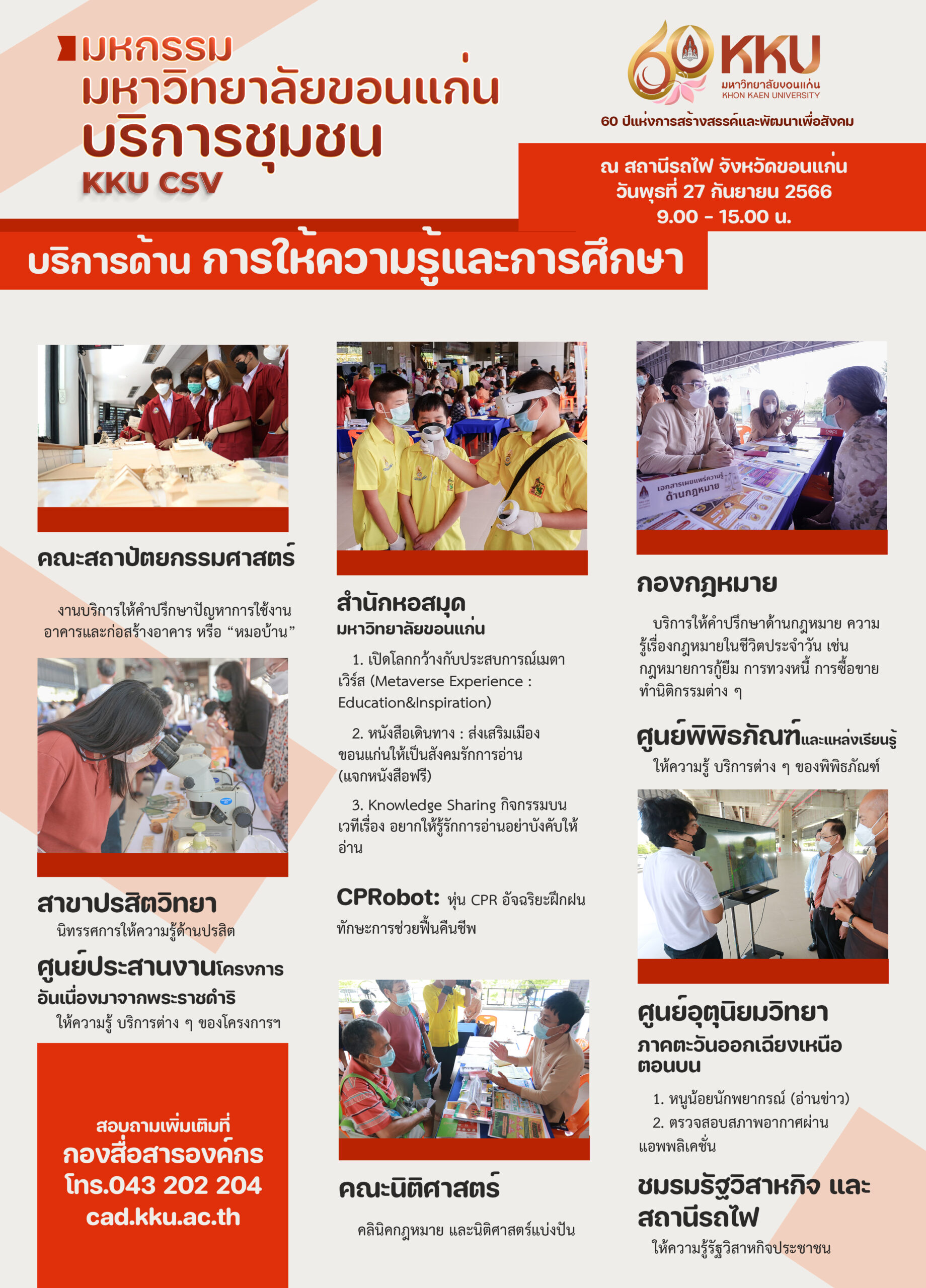 ผู้สนใจเข้าร่วมงาน สามารถลงชื่อเข้ารับบริการฟรี ณ สถานีรถไฟจังหวัดขอนแก่น วันที่ 27 กันยายน 2566 เวลา 9.00 น. – 15.00 น. สอบถามข้อมูลเพิ่มเติมได้ที่กองสื่อสารองค์กร มหาวิทยาลัยขอนแก่น 043 202 204 หรือรายละเอียดตามเอกสารแนบ โปสเตอร์ และทางเพจ Khon Kaen University
