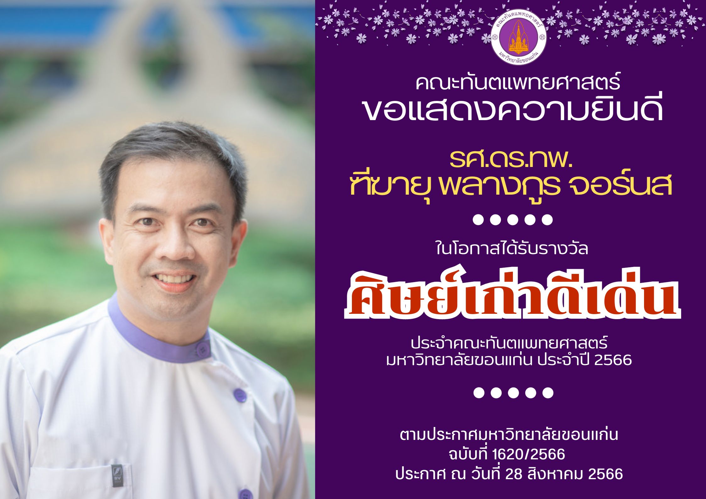 คณะทันตแพทยศาสตร์ มหาวิทยาลัยขอนแก่น ขอร่วมชื่นชมและแสดงความยินดีกับ รศ.ดร.ทพ.ฑีฆายุ พลางกูร จอร์นส ในโอกาสได้รับรางวัล “ศิษย์เก่าดีเด่น” ประจำคณะทันตแพทยศาสตร์ มหาวิทยาลัยขอนแก่น ประจำปี 2566