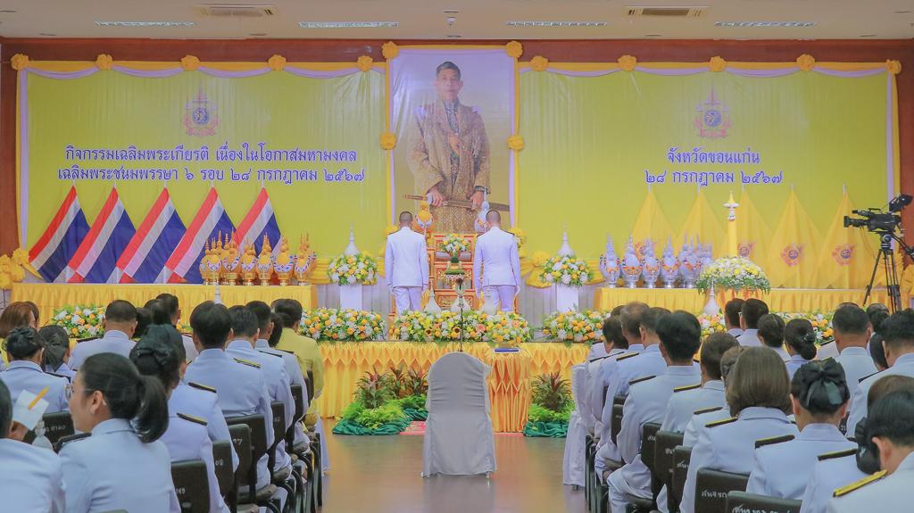 เมื่อวันอาทิตย์ที่ 28 กรกฎาคม 2567 เวลา 17.30 น. ณ ห้องประชุมแก่นเมือง ชั้น 1 ศาลากลางจังหวัดขอนแก่น ได้มีการจัดพิธีถวายเครื่องราชสักการะและวางพานพุ่ม และพิธีจุดเทียนถวายพระพรชัยมงคล เฉลิมพระเกียรติพระบาทสมเด็จพระเจ้าอยู่หัว เนื่องในโอกาสวันเฉลิมพระชนมพรรษา 28 กรกฎาคม 2567 ซึ่งมี นายพันธุ์เทพ เสาโกศล รองผู้ว่าราชการจังหวัดขอนแก่น เป็นประธานในพิธีฯ มหาวิทยาลัยขอนแก่น โดย อาจารย์ณัฐสมล ธนกุลรังสฤษดิ์ รองอธิการบดีฝ่ายกฎหมายและสื่อสารองค์กร นำคณะผู้บริหาร และบุคลากร เข้าร่วมพิธีฯ ภายในงานมี หัวหน้าส่วนราชการ หน่วยงานรัฐวิสาหกิจ องค์กรปกครองส่วนท้องถิ่น ภาคเอกชน และภาคประชาชน ประกอบด้วย ข้าราชการพลเรือน พนักงานรัฐวิสาหกิจ ข้าราชการทหาร ตำรวจ ประธานแม่บ้านมหาดไทยจังหวัด องค์กรเอกชน นักเรียน นักศึกษา จิตอาสาพระราชทาน ประชาชน โดยมีการประดับเข็มที่ระลึกเฉลิมพระเกียรติพระบาทสมเด็จพระเจ้าอยู่หัว เนื่องในโอกาสมหามงคลพระราชพิธีเฉลิมพระชนมพรรษา 6 รอบ 28 กรกฎาคม 2567 พร้อมเข็มที่ระลึกตราสัญลักษณ์พระราชพิธีบรมราชาภิเษก พุทธศักราช 2562 เข้าร่วมพิธีฯ อย่างพร้อมเพรียงกัน