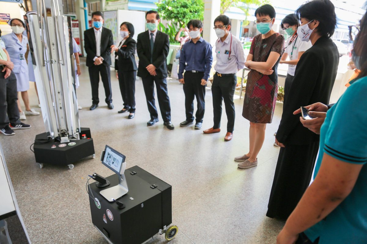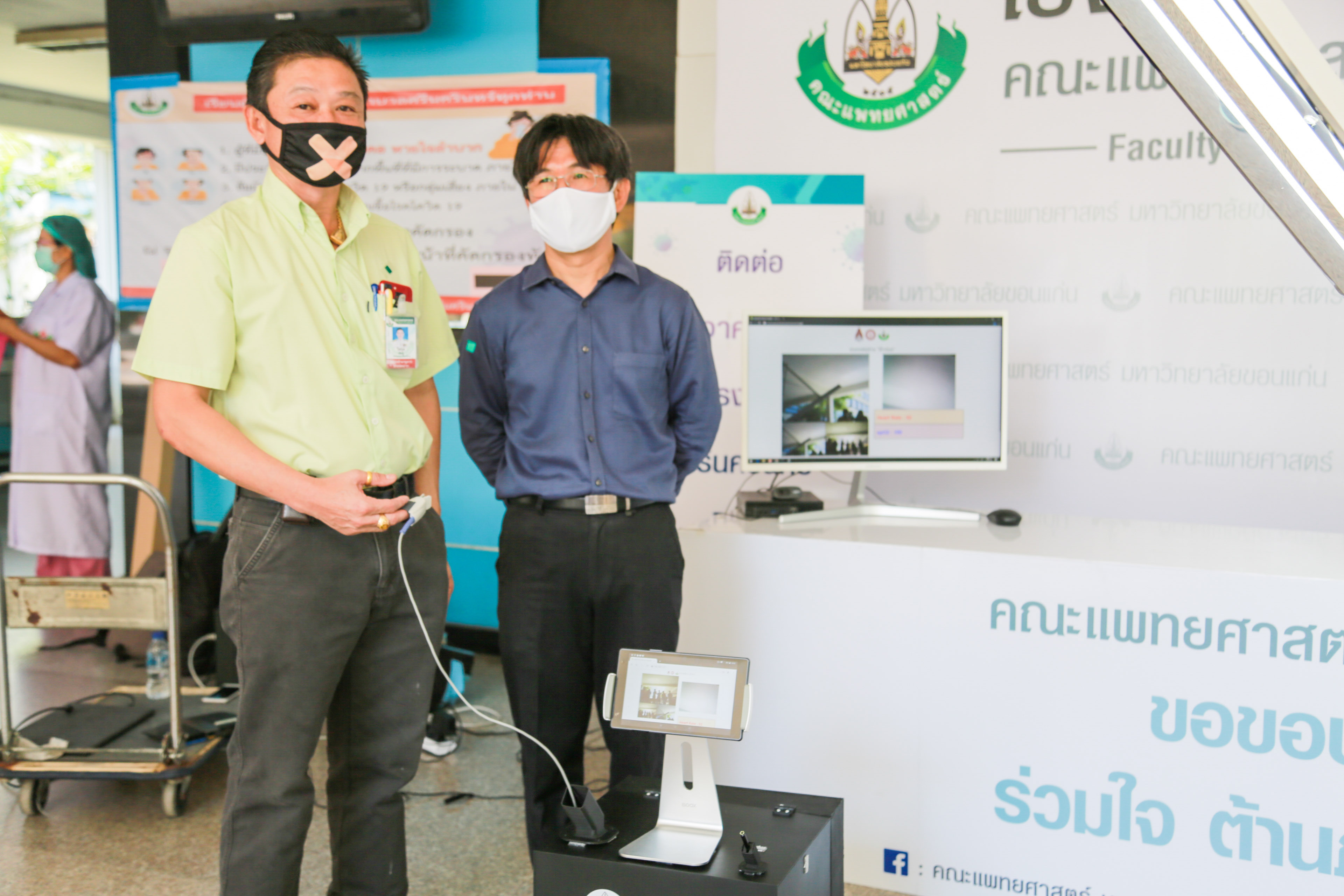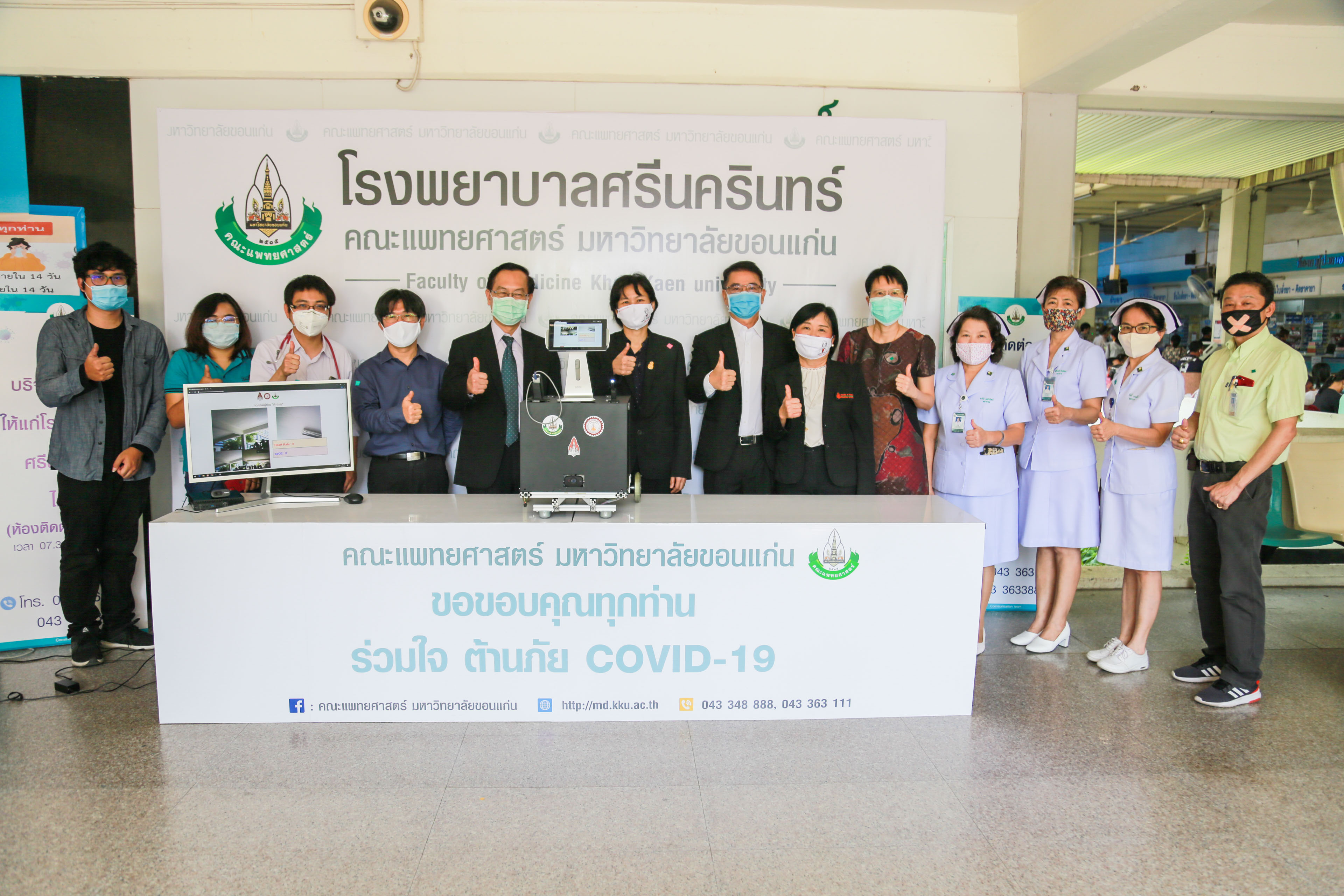 มหาวิทยาลัยขอนแก่น โดย กลุ่มวิจัยความเป็นเลิศเทคโนโลยีและนวัตกรรมทางการแพทย์ ร่วมกับ คณะแพทยศาสตร์ และคณะวิศวกรรมศาสตร์ ร่วมสร้าง “เครื่อง KKU Mobile CoVid-19 Killer และหุ่นยนต์ผู้ช่วยตัวน้อย” พร้อมมอบแด่ โรงพยาบาลศรีนครินทร์ คณะแพทยศาสตร์ มหาวิทยาลัยขอนแก่น โดยเมื่อวันที่ 29 เมษายน 2563 รศ.นพ.ชาญชัย พานทองวิริยะกุล รักษาการแทน อธิการบดีมหาวิทยาลัยขอนแก่น เป็นประธานในพิธีรับมอบ ร่วมด้วย ศ.ดร.ธิดารัตน์ บุญมาศ รองอธิการบดีฝ่ายนวัตกรรมและวิสาหกิจ รศ.นพ.อภิชาติ จิระวุฒิพงศ์ คณบดีคณะแพทยศาสตร์ มหาวิทยาลัยขอนแก่น รศ.พญ.ผกาพรรณ เกียรติชูสกุล หัวหน้าภาควิชากุมารเวชศาสตร์ คณะแพทยศาสตร์ มหาวิทยาลัยขอนแก่น และบุคลากรทางการแพทย์ ร่วมเป็นเกียรติในพิธีรับมอบนวัตกรรมด้านการแพทย์ที่ได้รับการสร้างสรรค์และพัฒนาโดยกลุ่มวิจัยความเป็นเลิศเทคโนโลยีและนวัตกรรมทางการแพทย์ นำโดย ศ.พญ.ผิวพรรณ มาลีวงษ์ ผู้ช่วยอธิการบดีฝ่ายวิจัยและบริการวิชาการ ร่วมกับ ผศ.ดร.ชัชชัย คุณบัว ภาควิชาวิศวกรรมคอมพิวเตอร์ คณะวิศวกรรมศาสตร์ มหาวิทยาลัยขอนแก่น และ ผศ.นพ.รัฐพล อุปลา ภาควิชากุมารเวชศาสตร์ คณะแพทยศาสตร์ มหาวิทยาลัยขอนแก่น และคณะทำงาน ณ โรงพยาบาลศรีนครินทร์ คณะแพทยศาสตร์ มหาวิทยาลัยขอนแก่น