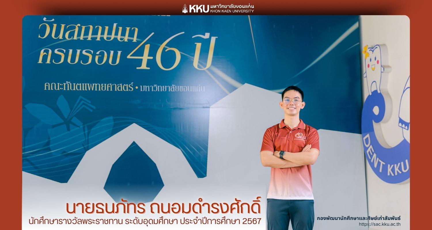 มหาวิทยาลัยขอนแก่น ขอแสดงความยินดีกับ นายธนภัทร ถนอมดำรงศักดิ์ ว่าที่บัณฑิตจากคณะทันตแพทยศาสตร์ ในโอกาสได้รับคัดเลือกให้เป็น “นักศึกษารางวัลพระราชทาน ระดับอุดมศึกษา ประจำปีการศึกษา 2567” (ตามประกาศของกระทรวงศึกษาธิการ ณ วันที่ 30 กรกฎาคม 2568) ซึ่งนับเป็นเกียรติประวัติสูงสุดของนักศึกษา และสร้างความภาคภูมิใจให้แก่มหาวิทยาลัยขอนแก่นเป็นอย่างยิ่ง เบื้องหลังความสำเร็จนี้ คือเรื่องราวของความมุ่งมั่น การบริหารจัดการเวลา และหัวใจที่เปี่ยมด้วยปณิธานในการอุทิศตนเพื่อสังคม