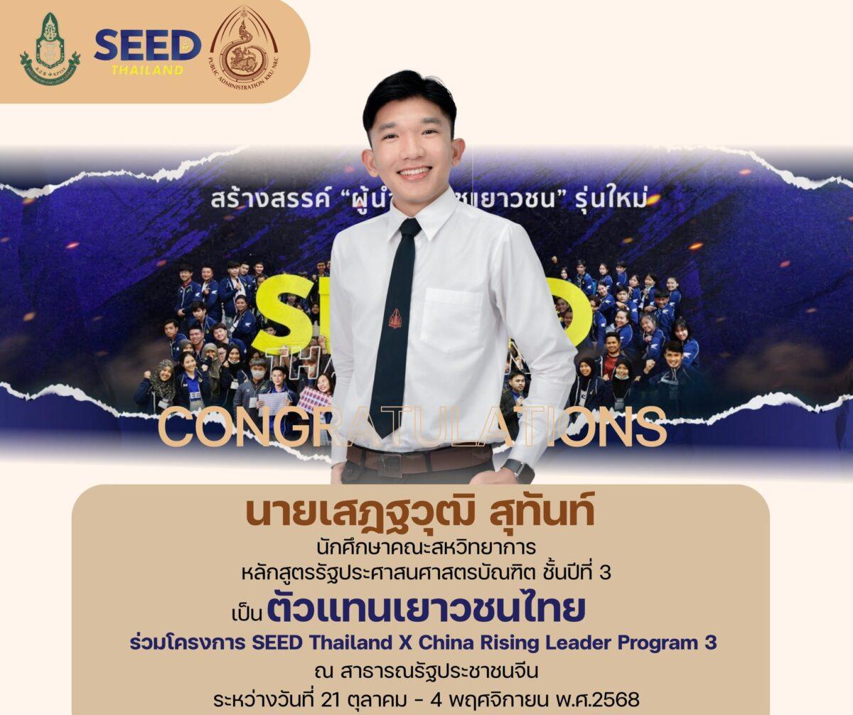 คณะสหวิทยาการ มหาวิทยาลัยขอนแก่น ขอแสดงความยินดีกับ นายเสฎฐวุฒิ สุทันท์ นักศึกษาชั้นปีที่ 3 หลักสูตรรัฐประศาสนศาสตรบัณฑิต ในโอกาสที่ได้รับคัดเลือกเป็นตัวแทนเยาวชนไทยเข้าร่วม “โครงการ SEED Thailand X China Rising Leader Program 3” ซึ่งเป็นเวทีเสริมสร้างผู้นำรุ่นใหม่ระดับนานาชาติ ที่จะจัดขึ้นระหว่างวันที่ 21 ตุลาคม ถึง 4 พฤศจิกายน 2568 ณ สาธารณรัฐประชาชนจีน