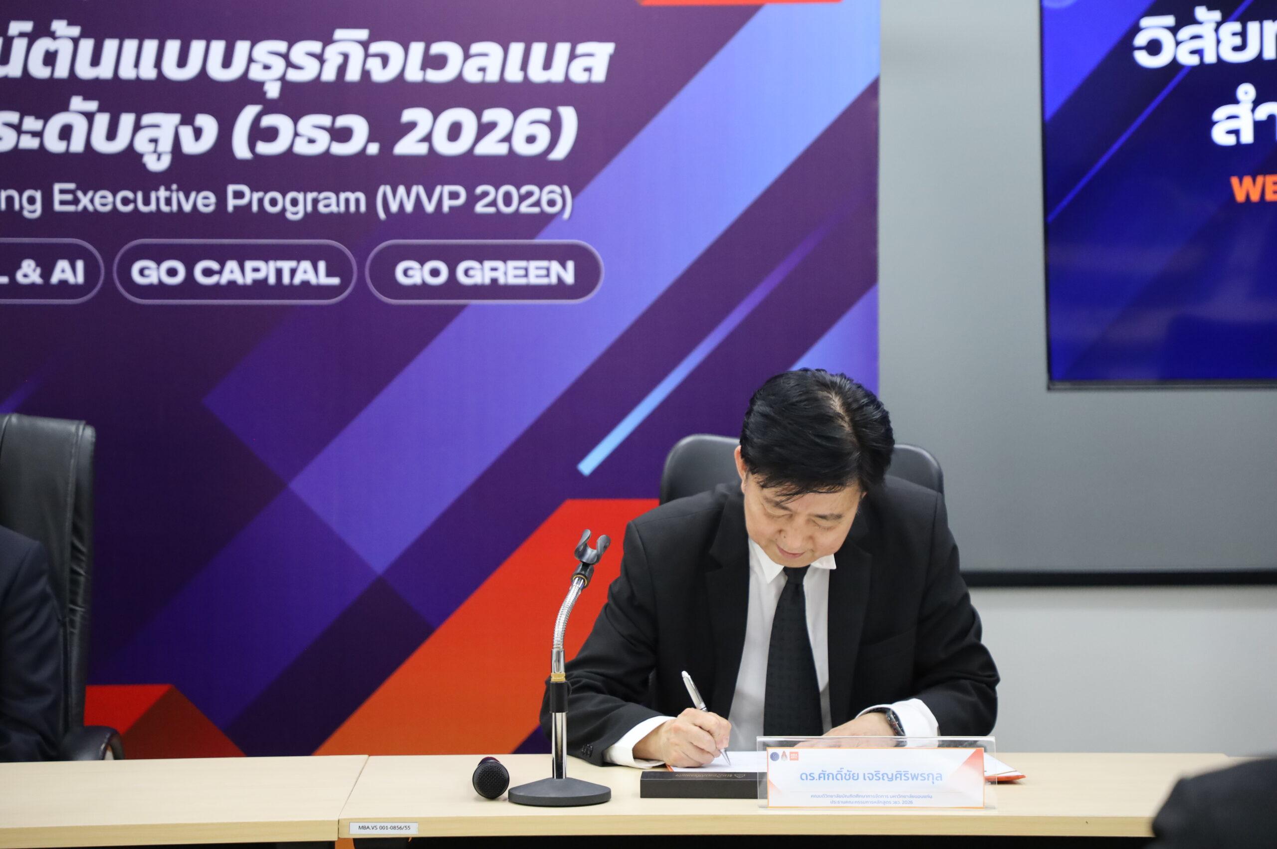 พิธีลงนามนำโดย ดร.ศักดิ์ชัย เจริญศิริพรกุล คณบดีวิทยาลัยบัณฑิตศึกษาการจัดการ และประธานคณะกรรมการหลักสูตร วธว.2026 พร้อมด้วย คุณสุวดี ปัญจริยางกูร ผู้อำนวยการศูนย์ GFGL และคณะกรรมการหลักสูตร