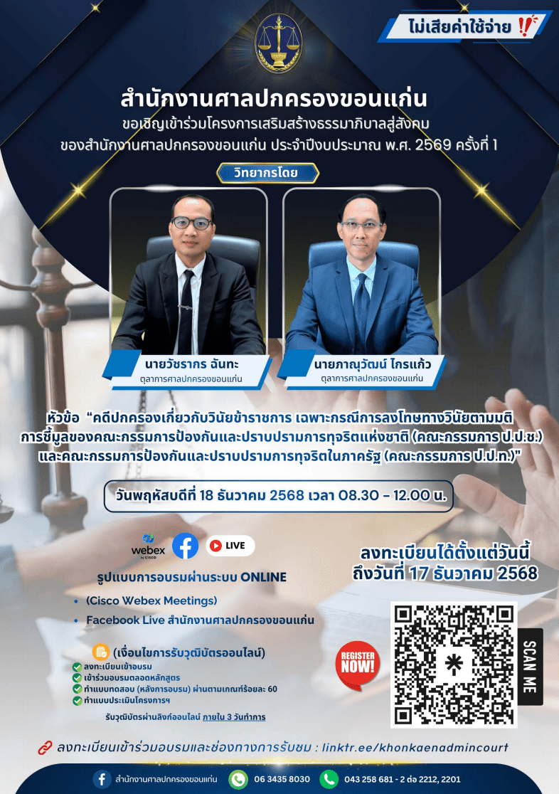 สำนักงานศาลปกครองขอนแก่นประกาศเชิญชวนบุคลากรภาครัฐและประชาชนทั่วไป เข้าร่วมโครงการเสริมสร้างธรรมาภิบาลสู่สังคม ประจำปีงบประมาณ พ.ศ. 2569 ครั้งที่ 1 ในหัวข้อ “คดีปกครองเกี่ยวกับวินัยข้าราชการ เฉพาะกรณีการลงโทษตามมติคณะกรรมการ ป.ป.ช. และ ป.ป.ท.” ซึ่งมุ่งให้ความรู้ด้านกฎหมายปกครองและหลักปฏิบัติราชการที่ถูกต้อง โปร่งใส และตรวจสอบได้