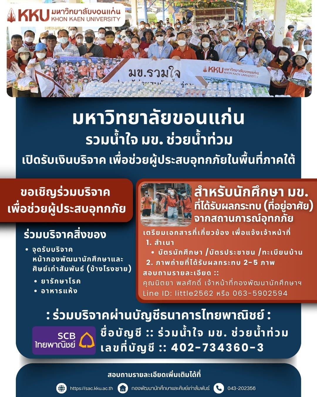 ทั้งนี้ ฝ่ายกิจการนักศึกษาและนวัตวณิชย์ มหาวิทยาลัยขอนแก่น ได้เปิดรับบริจาคสิ่งของจำเป็นและอาหารแห้งสำหรับถุงยังชีพ อาทิ ข้าวสาร, บะหมี่กึ่งสำเร็จรูป, อาหารกระป๋อง, นม, ขนม, ยาสามัญ ฯลฯ ณ กองพัฒนานักศึกษาและศิษย์เก่าสัมพันธ์ มหาวิทยาลัยขอนแก่น  ตลอดจนเปิดรับเงินบริจาคผ่านบัญชีธนาคารไทยพาณิชย์ ชื่อบัญชี : ร่วมน้ำใจ มข.ช่วยน้ำท่วม เลขที่บัญชี : 402-734360-3 โดยมีการจัดส่งผ่านทางอากาศยานสายการบินแอร์เอเชีย ซึ่งมหาวิทยาลัยขอนแก่นจะเปิดรับบริจาคจนถึงวันอังคารที่ 2 ธันวาคม 2568 นี้ เพื่อเร่งดำเนินการจัดส่งไปยังมหาวิทยาลัยสงขลานครินทร์ วิทยาเขตหาดใหญ่ สอบถามข้อมูลเพิ่มเติมได้ที่ : 043-202356