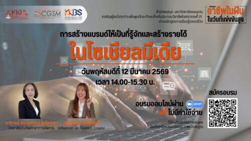 EP.2 : การสร้างแบรนด์ให้เป็นที่รู้จักและสร้างรายได้ในโซเชียลมีเดีย วิทยากรโดย อาจารย์ ดร.บุษกรณ์ ลีเจ้ยวะระ วิทยาลัยบัณฑิตศึกษาการจัดการ มหาวิทยาลัยขอนแก่น และ นางสาววรินทร์พร ศรีสุธีรัชต์ Influencer และ Content Creator ในวันพฤหัสบดีที่ 12 มีนาคม 2569 เวลา 14.00-15.30 น. ผ่าน Application Zoom ลงทะเบียนเข้าร่วมอบรมได้ที่ https://liblearning.kku.ac.th/seminars/1b3fce9b-88c6-4776-8b1b-041140e4e328