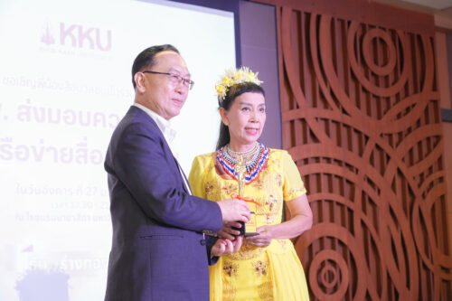 นายเจริญลักษณ์ เพ็ชรประดับ นายกสมาคมสื่อมวลชนจังหวัดขอนแก่น กล่าวถึงบทบาทของมหาวิทยาลัยว่า “ปัจจุบันนิเวศสื่อมีการเปลี่ยนแปลงไปมาก ซึ่งเราต้องสร้างความเข้าใจร่วมกันทั้งในบทบาทและผลกระทบของการนำเสนอเนื้อหา อย่างไรก็ตาม ผมขอชื่นชมมหาวิทยาลัยขอนแก่นที่มีการปรับตัวได้อย่างโดดเด่นและก้าวทันความเปลี่ยนแปลงเสมอ เดิมทีเรามองว่า มข. คือขุมทรัพย์ทางปัญญาของภาคอีสาน แต่ในวันนี้ มข. กำลังก้าวสู่การเป็น ‘ขุมทรัพย์ทางเศรษฐกิจ’ ด้วยยุทธศาสตร์สำคัญอย่าง KKU Wellness Center บนพื้นที่ใจกลางเมืองกว่า 5,000 ไร่ ซึ่งจะสร้างมูลค่ามหาศาลให้กับจังหวัด ผมจึงขอให้อธิการบดีและคณะผู้บริหารนำพามหาวิทยาลัยให้เป็นที่พึ่งทั้งทางปัญญาและทางเศรษฐกิจของคนอีสานสืบต่อไป”
