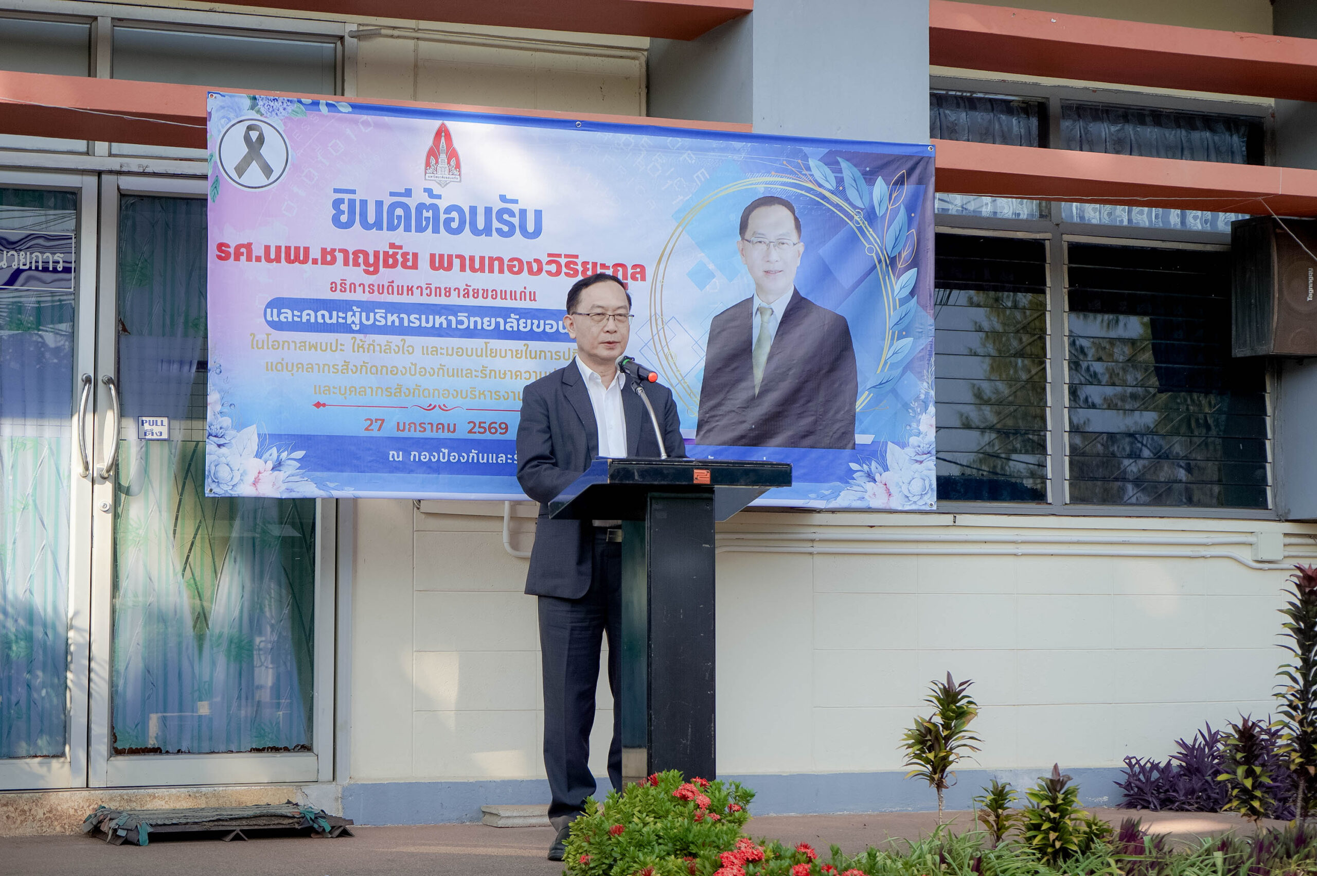 วันที่ 27 มกราคม 2569 รองศาสตราจารย์ นายแพทย์ชาญชัย พานทอง วิริยะกุล อธิการบดีมหาวิทยาลัยขอนแก่น พร้อมด้วยคณะผู้บริหารมหาวิทยาลัย ได้พบปะบุคลากรกองป้องกันและรักษาความปลอดภัย และงานบริการยานพาหนะ กองบริหารงานกลาง มหาวิทยาลัยขอนแก่น เพื่อมอบนโยบายในการปฏิบัติงาน พร้อมให้โอวาท ส่งความปรารถนาดี และเป็นขวัญกำลังใจแก่บุคลากรด้านการบริการยานพาหนะ และบุคลากรด้านการรักษาความปลอดภัย