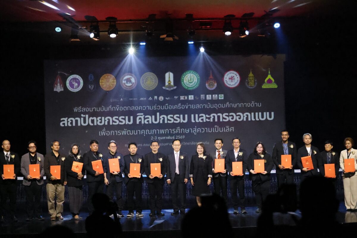 วันที่ 2 กุมภาพันธ์ 2569 คณะศิลปกรรมศาสตร์ และคณะสถาปัตยกรรมศาสตร์ มหาวิทยาลัยขอนแก่น ร่วมเป็นเจ้าภาพจัดการประชุมสัมมนาเครือข่ายสถาบันอุดมศึกษาทางด้านสถาปัตยกรรม ศิลปกรรมและการออกแบบ เพื่อการพัฒนาคุณภาพการศึกษาสู่ความเป็นเลิศ ณ โรงละครคณะศิลปกรรมศาสตร์ มหาวิทยาลัยขอนแก่น โดยมีผู้บริหาร คณาจารย์ และบุคลากรจากเครือข่าย 12 สถาบันการศึกษา 16 คณะวิชา เข้าร่วมกว่า 200 คน บรรยากาศเป็นไปอย่างสง่างามและเปี่ยมด้วยพลังแห่งความร่วมมือทางวิชาการ ซึ่งการจัดงานดำเนินการในระหว่างวันที่ 2-3 กุมภาพันธ์ 2569