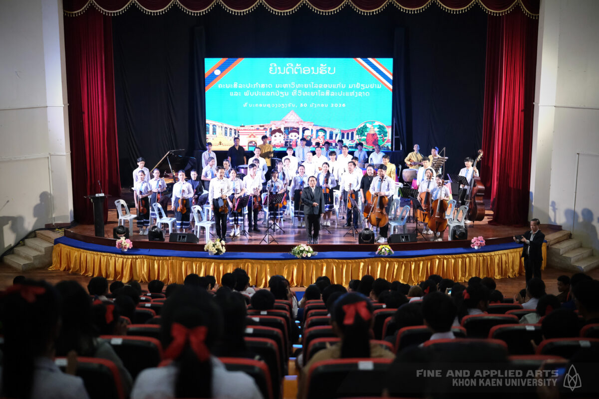 เมื่อวันที่ 29 มกราคม – 1 กุมภาพันธ์ 2569 คณะศิลปกรรมศาสตร์ มหาวิทยาลัยขอนแก่น โดยหลักสูตรวิชาดนตรีตะวันตก สาขาวิชาดุริยางคศิลป์ จัดโครงการ “ดนตรีสัญจร” ประจำปีงบประมาณ 2569 โดยมี ผู้ช่วยศาสตราจารย์ ดร.กฤษฎา วงศ์คำจันทร์ ประธานโครงการดนตรีสัญจร เป็นหัวหน้าคณะ พร้อมด้วยคณาจารย์หลักสูตรวิชาดนตรีตะวันตก สาขาวิชาดุริยางคศิลป์ และนักศึกษาร่วมเดินทางทั้งสิ้น 45 คน ณ โรงเรียนศิลปะแห่งชาติ นครหลวงเวียงจันทน์ สาธารณรัฐประชาธิปไตยประชาชนลาว