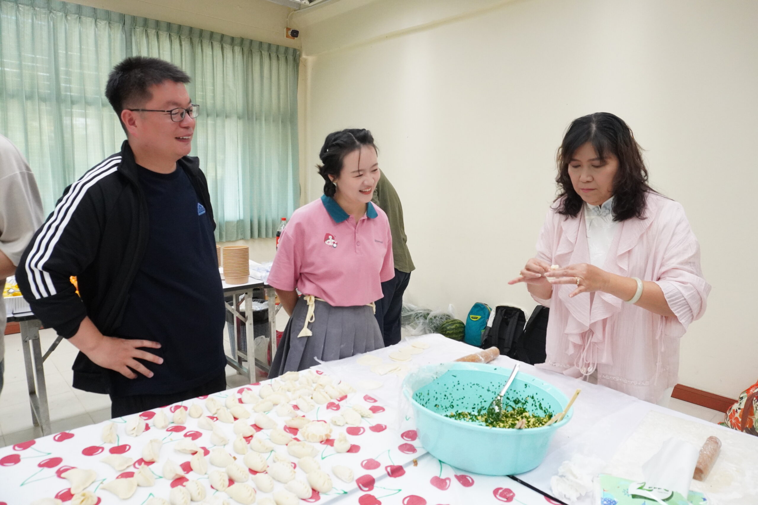 หลังจากนั้นเป็นการแลกเปลี่ยนวัฒนธรรมด้านอาหารจีนที่แต่ละชนิดล้วนมีความหมายมงคลในเทศกาลตรุษจีน ร่วมกันปั้นเกี๊ยว เกี๊ยวต้มมีรูปร่างคล้ายทองคำโบราณ เป็นสัญลักษณ์แห่งความร่ำรวยและความอุดมสมบูรณ์ ข้าวต้มมัดที่แสดงถึงความสามัคคีและความเป็นน้ำหนึ่งใจเดียวกันของครอบครัว ยำเห็ดหูหนูดำและแตงกวาดองที่นำมาซึ่งความสดชื่นและอายุยืน ไข่เจียวมะเขือเทศที่สีแดงเป็นสีมงคลแห่งความสุขและความโชคดี ปีกไก่เคียวที่หมายถึงความเป็นปึกแผ่นและการพึ่งพาอาศัยกันในครอบครัว เต้าหู้เผ็ดที่เป็นสัญลักษณ์ของความร่วมมือและความสามัคคี และซี่โครงหมูตุ๋นที่แทนความอบอุ่นและความรักของครอบครัว พร้อมด้วยผลไม้และเครื่องดื่ม โดยมีคณาจารย์ นักศึกษาบัณฑิตศึกษาชาวจีน และนักศึกษาไทยเข้าร่วมกิจกรรมกว่า 60 คน ในบรรยากาศแห่งความสุขและการแลกเปลี่ยนเรียนรู้วัฒนธรรมที่แตกต่างแต่กลมกลืนกัน