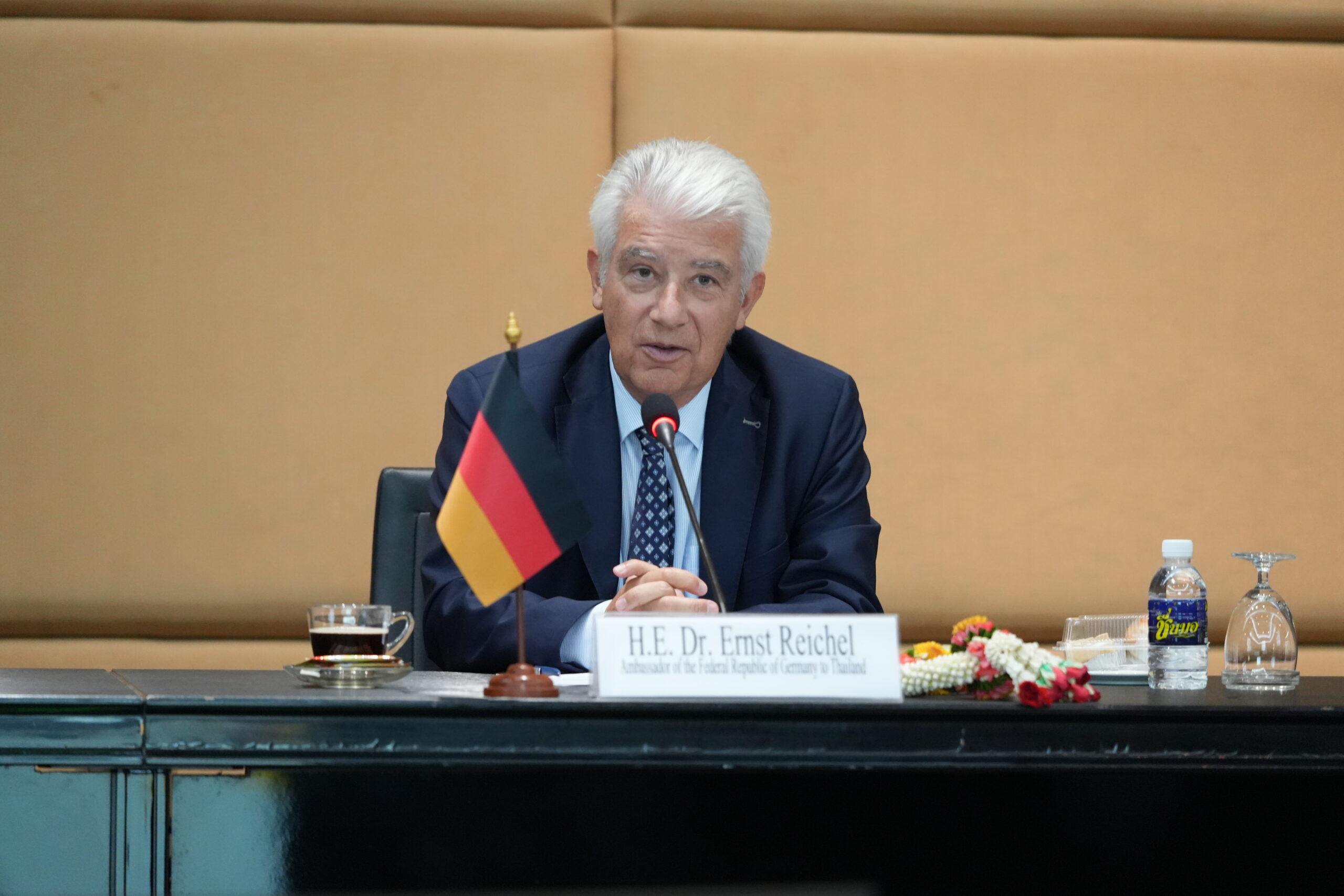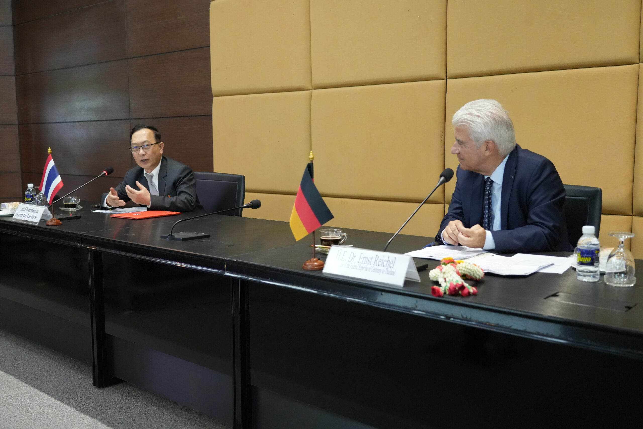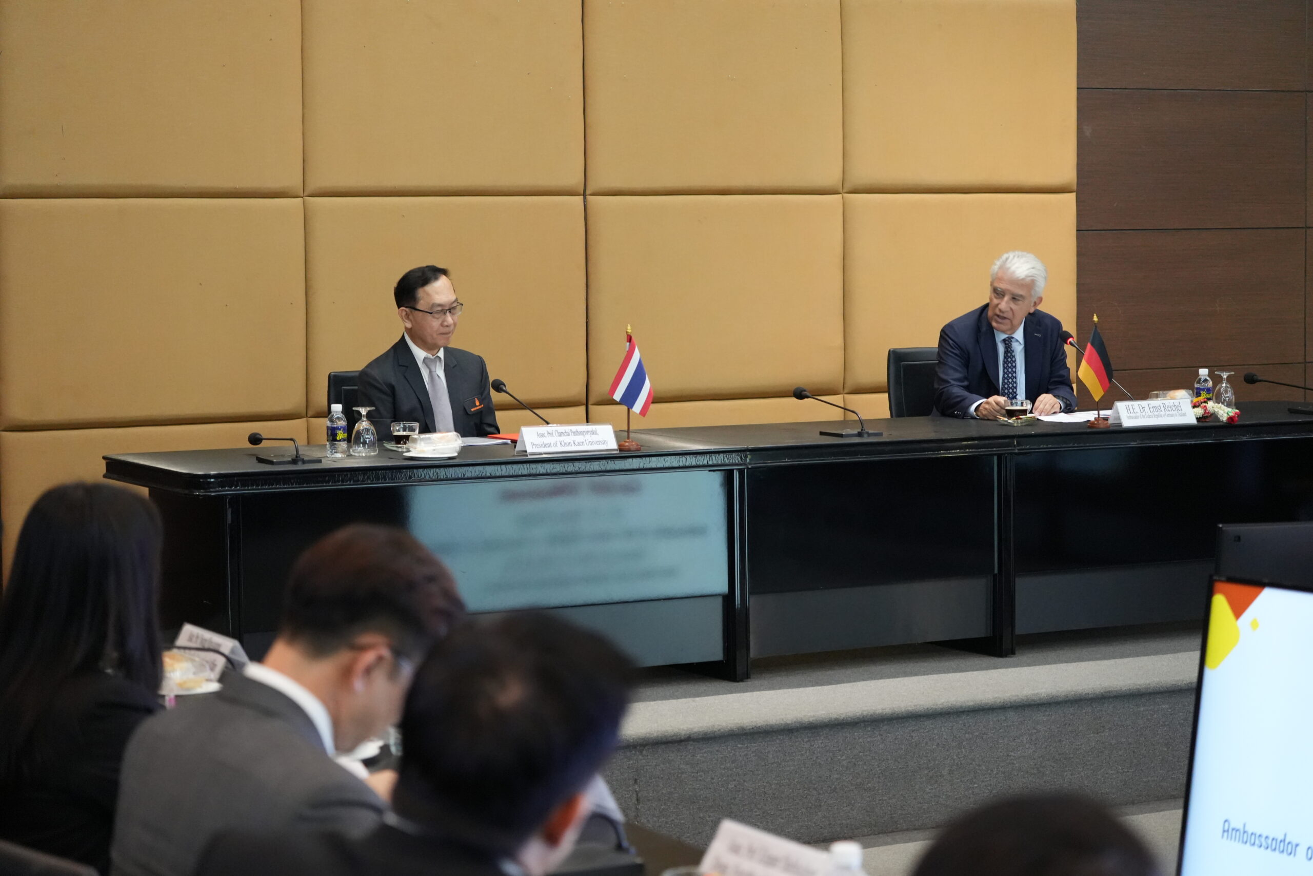 ด้าน H.E. Dr. Ernst Wolfgang Reichel เอกอัครราชทูตสหพันธ์สาธารณรัฐเยอรมนีประจำประเทศไทย ได้กล่าวขอบคุณมหาวิทยาลัยขอนแก่นสำหรับการต้อนรับอย่างอบอุ่น พร้อมแสดงความชื่นชมต่อบทบาท ของมหาวิทยาลัยขอนแก่นในฐานะสถาบันการศึกษาและวิจัยชั้นนำของภูมิภาค ที่มีความเข้มแข็งด้านการวิจัยและสามารถผลิตผลงานที่มีคุณภาพและศักยภาพในระดับนานาชาติ