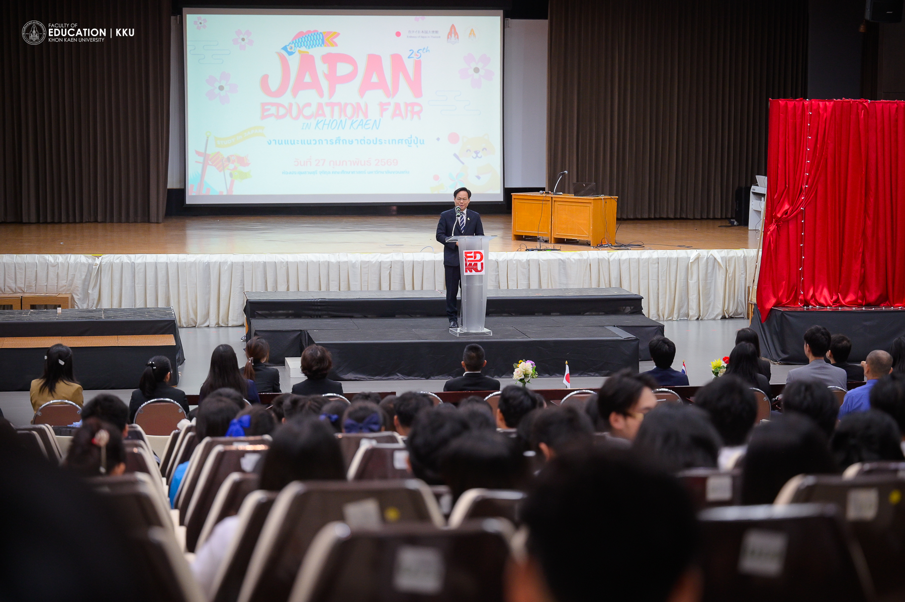 คณะศึกษาศาสตร์ มหาวิทยาลัยขอนแก่น ร่วมกับสถานเอกอัครราชทูตญี่ปุ่นประจำประเทศไทย และชมรมนักเรียนเก่าญี่ปุ่นภาคตะวันออกเฉียงเหนือ จัดงานแนะแนวการศึกษาต่อประเทศญี่ปุ่นครั้งที่ 25 (The 25th Japan Education Fair in Khon Kaen) เมื่อวันที่ 27 กุมภาพันธ์ 2569 ณ ห้องประชุมสายสุรี จุติกุล โดยมี Mr. TANIMURA Takamasa เลขานุการเอก สถานเอกอัครราชทูตญี่ปุ่นประจำประเทศไทย เป็นประธานในพิธี ผศ.ดร.อัจฉราวรรณ โตภาคงาม ผู้ช่วยอธิการบดีฝ่ายการต่างประเทศ รศ.ดร.อิศรา ก้านจักร คณบดีคณะศึกษาศาสตร์ ผศ.ดร.ศราวุธ จักรเป็ง รองคณบดีฝ่ายโรงเรียนสาธิต ศ.ดร.ทพ.ธีระศักดิ์ ดำรงรุ่งเรือง ในนามสมาคมศิษย์เก่าญี่ปุ่นภาคตะวันออกเฉียงเหนือ ร่วมกล่าวต้อนรับ พร้อมด้วยผู้บริหาร ผู้แทนมหาวิทยาลัยและองค์ญี่ปุ่น และแขกผู้มีเกียรติเข้าร่วมในพิธีเปิด กิจกรรมนี้ถือเป็นเวทีแลกเปลี่ยนข้อมูลการศึกษาต่อที่ดำเนินมาอย่างต่อเนื่องกว่า 25 ปี เพื่อสร้างแรงบันดาลใจให้นักเรียนและนักศึกษาได้ขยายขอบเขตการเรียนรู้สู่ระดับสากลและเข้าถึงโอกาสทางการศึกษาในสถาบันชั้นนำ ณ ประเทศญี่ปุ่น