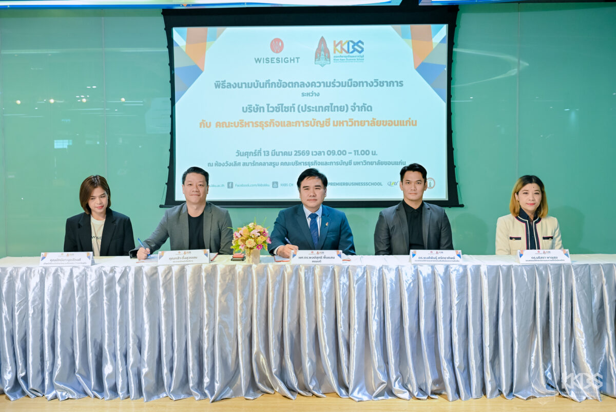 เมื่อวันที่ 13 มีนาคม 2569 คณะบริหารธุรกิจและการบัญชี มหาวิทยาลัยขอนแก่น จัดพิธีลงนามบันทึกข้อตกลงความร่วมมือทางวิชาการ (MOU) ระหว่าง มหาวิทยาลัยขอนแก่น โดยคณะบริหารธุรกิจและการบัญชี กับ บริษัท ไวซ์ไซท์ (ประเทศไทย) จำกัด (Wisesight) เพื่อส่งเสริมความร่วมมือด้านการศึกษา การพัฒนาหลักสูตร และการเสริมสร้างทักษะที่จำเป็นต่อโลกธุรกิจยุคดิจิทัล โดยในพิธีลงนามได้รับเกียรติจากผู้บริหารทั้งสองหน่วยงาน ประกอบไปด้วย ผู้ช่วยศาสตราจารย์ ดร.พงษ์สุทธิ พื้นแสน คณบดีคณะบริหารธุรกิจและการบัญชี ดร.พงศ์พันธุ์ ศรัทธาทิพย์ รองคณบดีฝ่ายอุตสาหกรรมสัมพันธ์และความยั่งยืน และ ดร.นริสรา พาลุสุข รองคณบดีฝ่ายบริหารและภาพลักษณ์องค์กร พร้อมด้วย คุณกล้า ตั้งสุวรรณ ประธานเจ้าหน้าที่บริหาร บริษัท ไวซ์ไซท์ (ประเทศไทย) จำกัด และ คุณมัทนียา บุดดีวงศ์ เจ้าหน้าที่อาวุโสฝ่ายวิเคราะห์โจทย์ธุรกิจและโซลูชัน ซึ่งจัดขึ้น ณ ห้องวังเลิศ คณะบริหารธุรกิจและการบัญชี มหาวิทยาลัยขอนแก่น