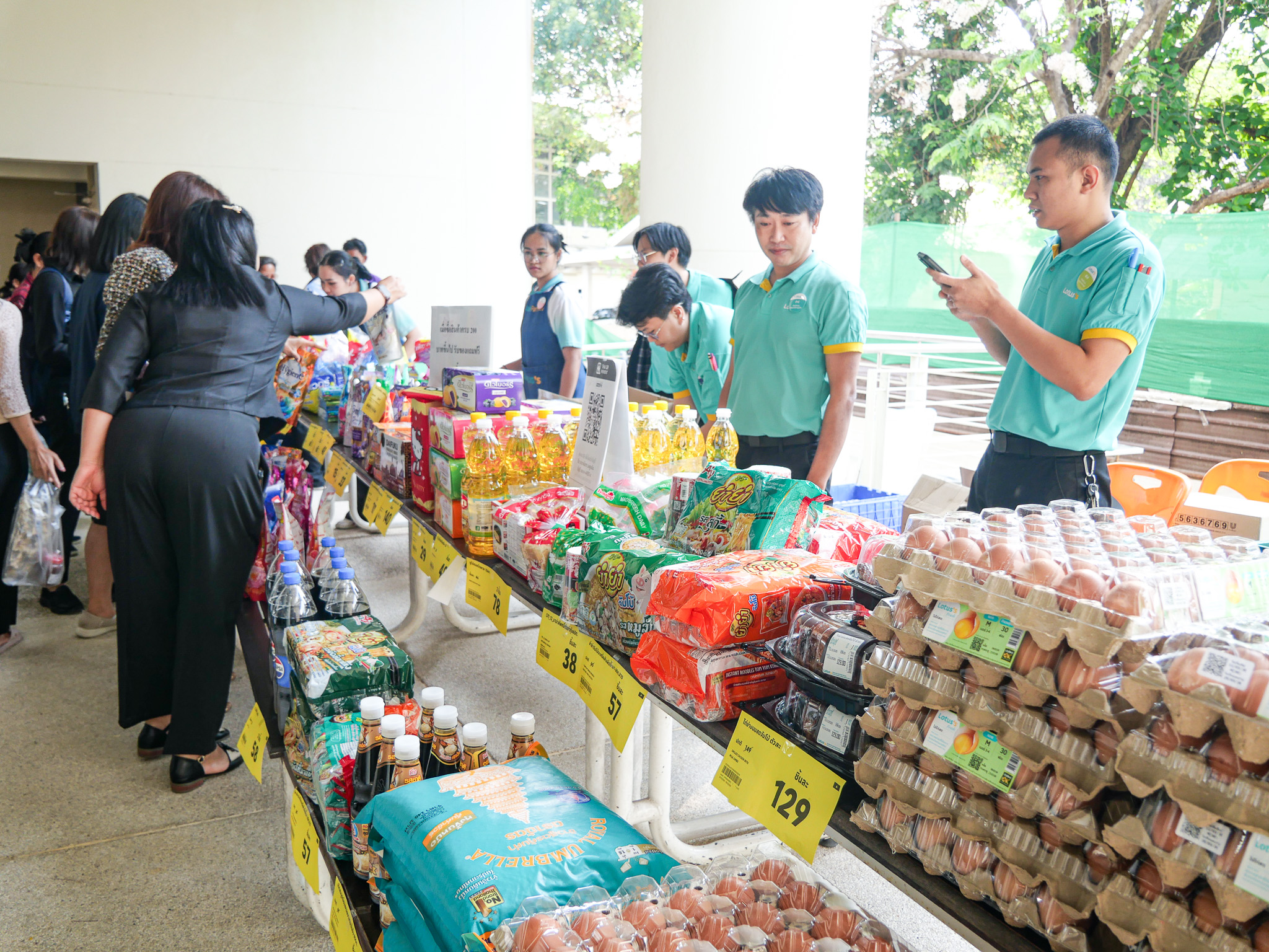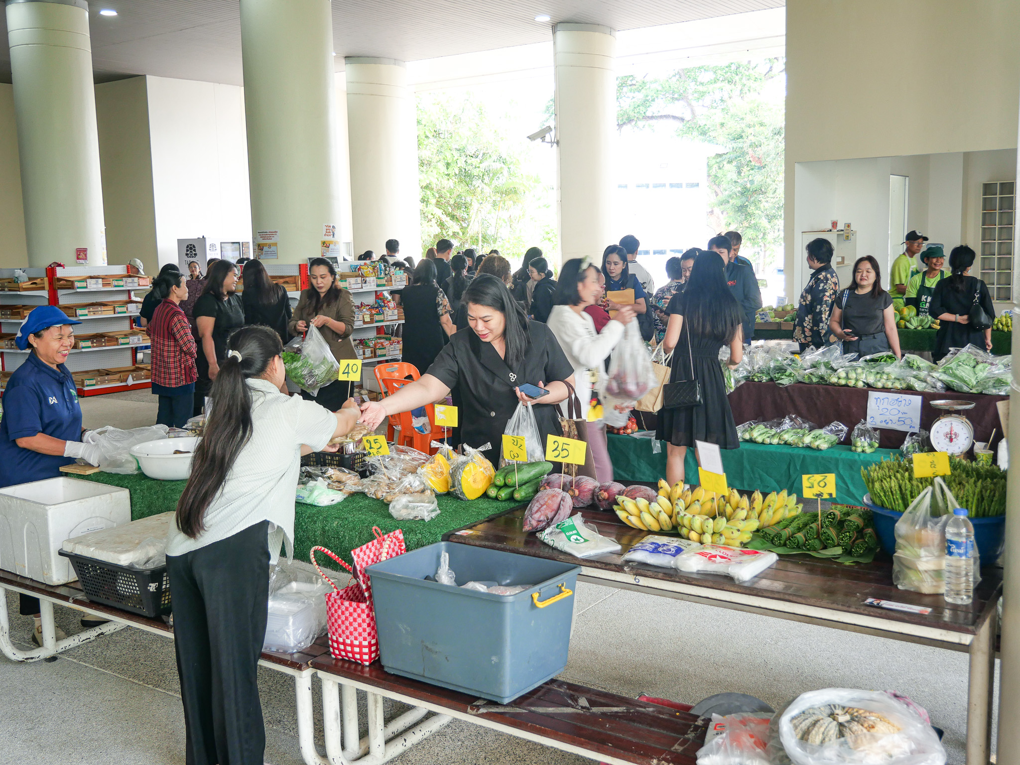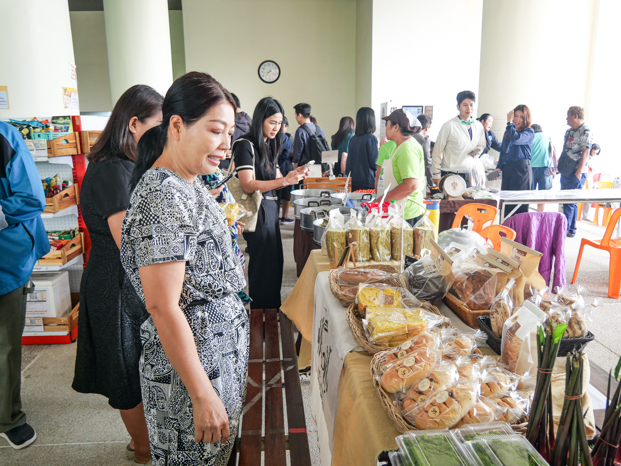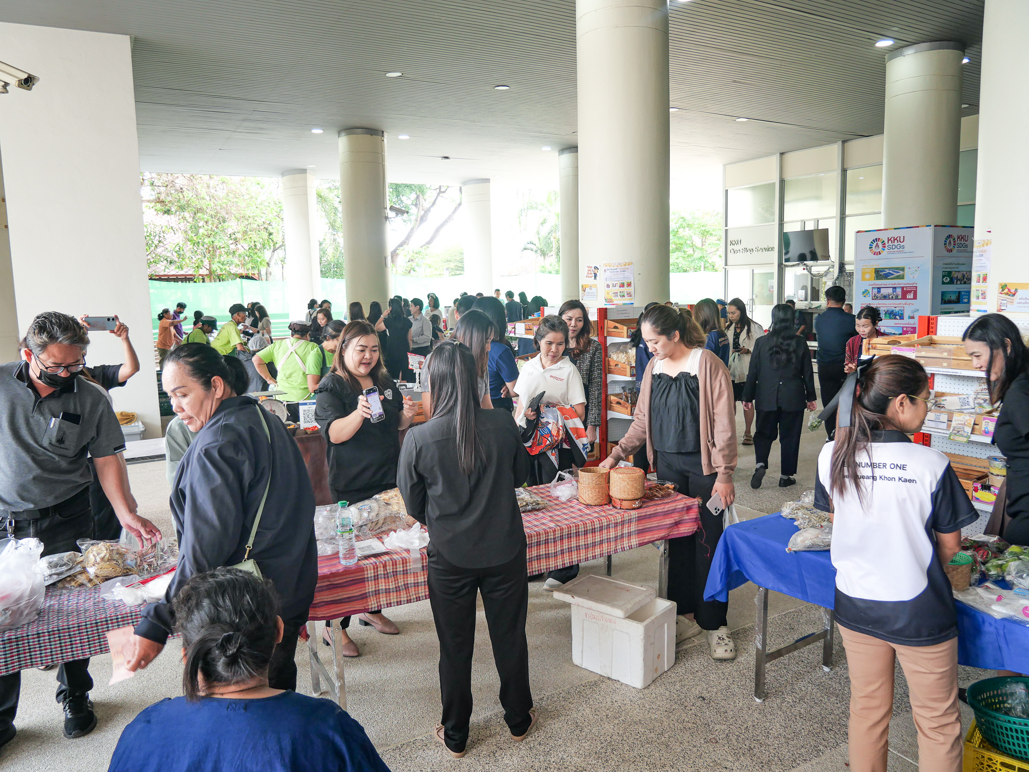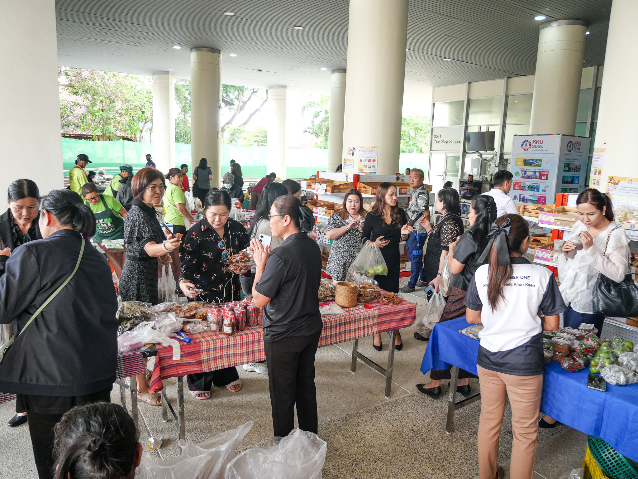 บรรยากาศภายในงานเต็มไปด้วยความคึกคักจากร้านค้าหลากหลายเครือข่ายที่เข้าร่วม อาทิ บริษัท ซีพีแอกซ์ตร้า จำกัด กลุ่มวิสาหกิจชุมชนบ้านโพธิ์ตาก สวนสลัดจันทร์ดาว วิสาหกิจชุมชนบ้านค้อ รวมถึง สินค้าตลาดเขียวจากชมรมบุคลากรอาวุโส มหาวิทยาลัยขอนแก่น โดยนำผลิตภัณฑ์อาหารสด อาหารแปรรูป ผักปลอดภัย และสินค้าชุมชนคุณภาพมาจำหน่าย ซึ่งได้รับความสนใจจากบุคลากรและผู้เข้าร่วมงานเป็นจำนวนมากตลอดช่วงกิจกรรม