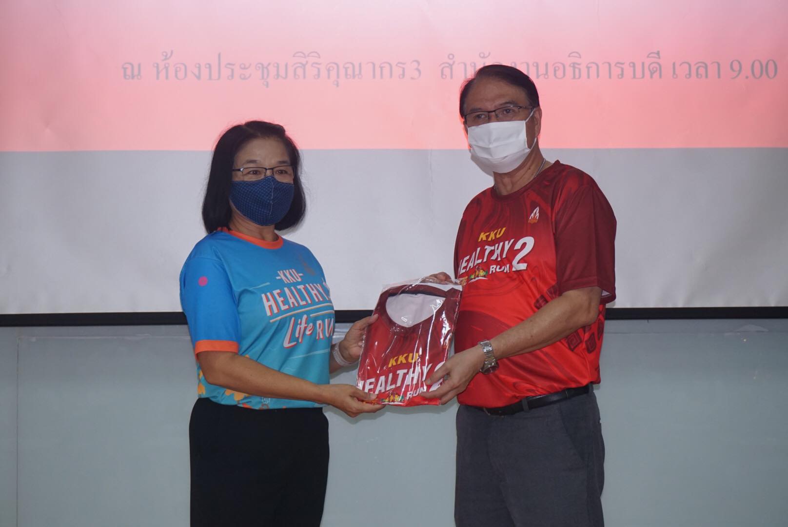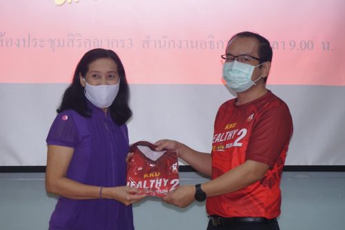รศ.ดร.เกรียงไกร กิจเจริญ รองอธิการบดีฝ่ายทรัพยากรบุคคล มข.กล่าวต้อนรับและยินดีกับผู้ร่วมโครงการว่า ขอแสดงความยินดีกับผู้เข้าร่วมโครงการที่สามารถบรรลุเป้าหมายระยะทางตามที่โครงการกำหนดไว้ ซึ่งผู้ที่ถึงเป้าหมายมีอยู่จำนวนมากจากผู้ร่วมโครงการจำนวน 835 คน แต่ด้วยสถานการณ์ปัจจุบันในเรื่องการควบคุมโรคจึงจำเป็นต้องแบ่งจำนวนคนโดยจัดกิจกรรมแยกกัน สำหรับการรับมอบเสื้อพิชิตชัยซึ่งในรอบนี้เรามอบเสื้อจำนวน 100 ตัว เป็นที่น่ายินดีว่าถึงแม้จะเป็นช่วงสถานการณ์ไม่ปกติแต่ผู้ร่วมโครงการทุกท่านก็ยังให้ความสำคัญกับการดูแลตนเองด้วยการมาออกกำลังกายในโครงการครั้งนี้ เกิดปฏิสัมพันธ์ที่ดีในการออกมาพบปะกันในหมู่ผู้ที่รักการออกกำลังกายเกิดเป็นเครือข่ายที่ได้มาร่วมกันทำกิจกรรมที่เป็นประโยชน์ ซึ่งในโอกาสต่อไปฝ่ายทรัพยากรบุคคล มข.ก็จะพยายามหากิจกรรมเพื่อส่งเสริมการมีสุขภาพกายสุขภาพใจที่ดีมาเพื่อให้บุคลากรได้ร่วมกิจกรรมกันต่อไป