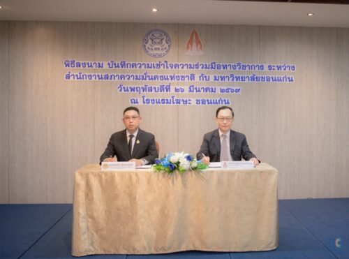 เมื่อวันพฤหัสบดีที่ 26 มีนาคม 2569 เวลา 09.00–09.30 น. ณ ห้องประชุมอีสานเทอร์เรส 1 โรงแรมโฆษะ จังหวัดขอนแก่น มหาวิทยาลัยขอนแก่น (มข.) เข้าร่วมพิธีลงนามบันทึกความเข้าใจ (MOU) ความร่วมมือทางวิชาการร่วมกับสำนักงานสภาความมั่นคงแห่งชาติ (สมช.) โดยมีนายภพหล้า ปิยะปานันท์ ที่ปรึกษาด้านนโยบายและยุทธศาสตร์ความมั่นคง ปฏิบัติราชการแทนเลขาธิการสภาความมั่นคงแห่งชาติ และ รศ.นพ.ชาญชัย พานทองวิริยะกุล อธิการบดีมหาวิทยาลัยขอนแก่น เป็นผู้ลงนามฝ่ายละหนึ่งท่าน พร้อมด้วยพยานฝ่าย มข. 2 ท่าน ผศ.สิริมนพร ทิพสิงห์ คณบดีวิทยาลัยนานาชาติ และ ผศ.ดร.กีรติพร จูตะวิริยะ รักษาการผู้อำนวยการศูนย์วิจัยพหุลักษณ์สังคมลุ่มน้ำโขง และศูนย์อาเซียนศึกษา และ พยานฝ่าย สมช. 2 ท่าน นางสาวมัณฑนา มาศมาลัย ผู้เชี่ยวชาญเฉพาะด้านปัญหาความมั่นคงข้ามชาติ และนางสาวสุนิสา แพรภัทรประสิทธิ์ รักษาการผู้อำนวยการสถาบันความมั่นคงศึกษา
