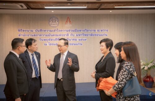 เมื่อวันพฤหัสบดีที่ 26 มีนาคม 2569 เวลา 09.00–09.30 น. ณ ห้องประชุมอีสานเทอร์เรส 1 โรงแรมโฆษะ จังหวัดขอนแก่น มหาวิทยาลัยขอนแก่น (มข.) เข้าร่วมพิธีลงนามบันทึกความเข้าใจ (MOU) ความร่วมมือทางวิชาการร่วมกับสำนักงานสภาความมั่นคงแห่งชาติ (สมช.) โดยมีนายภพหล้า ปิยะปานันท์ ที่ปรึกษาด้านนโยบายและยุทธศาสตร์ความมั่นคง ปฏิบัติราชการแทนเลขาธิการสภาความมั่นคงแห่งชาติ และ รศ.นพ.ชาญชัย พานทองวิริยะกุล อธิการบดีมหาวิทยาลัยขอนแก่น เป็นผู้ลงนามฝ่ายละหนึ่งท่าน พร้อมด้วยพยานฝ่าย มข. 2 ท่าน ผศ.สิริมนพร ทิพสิงห์ คณบดีวิทยาลัยนานาชาติ และ ผศ.ดร.กีรติพร จูตะวิริยะ รักษาการผู้อำนวยการศูนย์วิจัยพหุลักษณ์สังคมลุ่มน้ำโขง และศูนย์อาเซียนศึกษา และ พยานฝ่าย สมช. 2 ท่าน นางสาวมัณฑนา มาศมาลัย ผู้เชี่ยวชาญเฉพาะด้านปัญหาความมั่นคงข้ามชาติ และนางสาวสุนิสา แพรภัทรประสิทธิ์ รักษาการผู้อำนวยการสถาบันความมั่นคงศึกษา