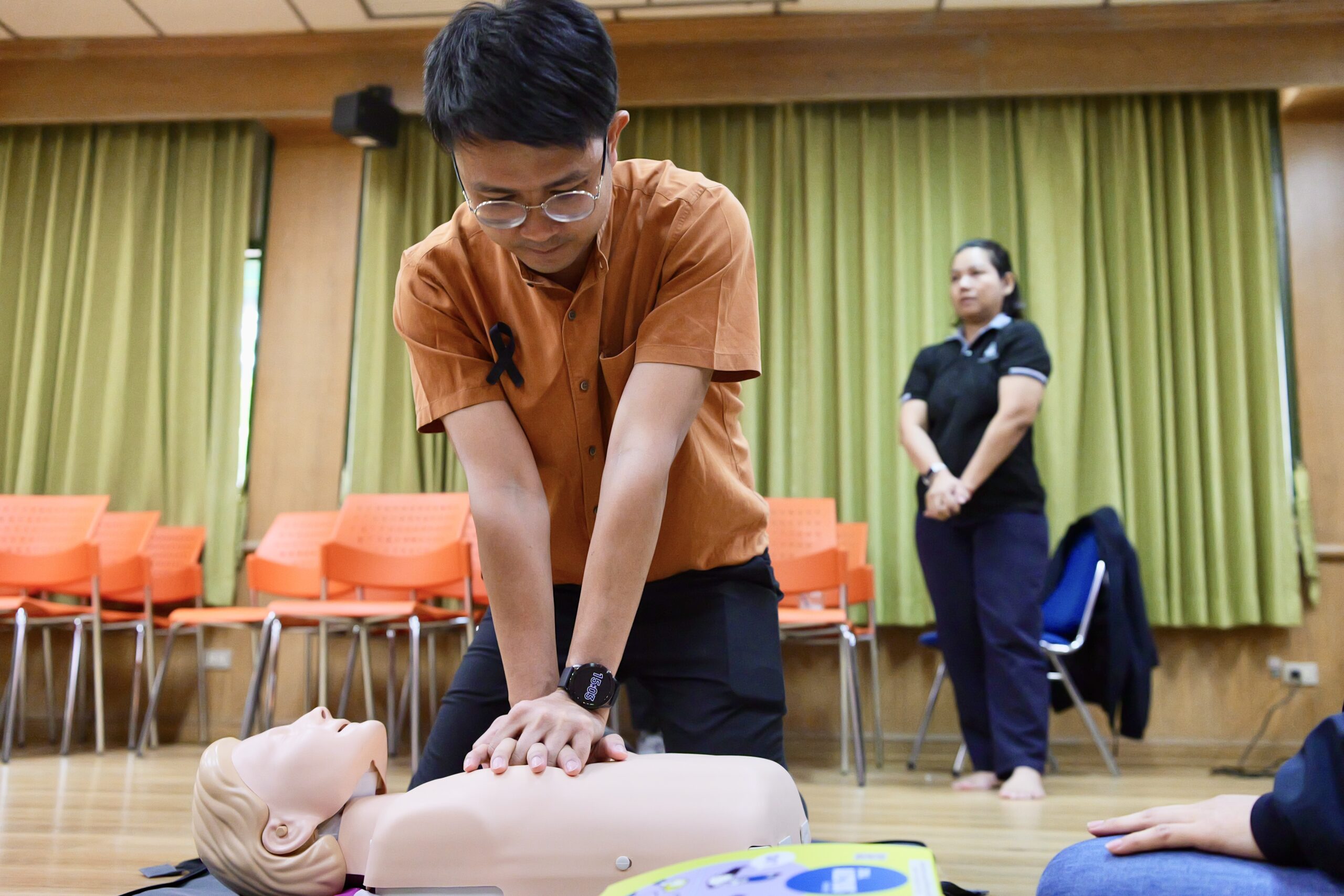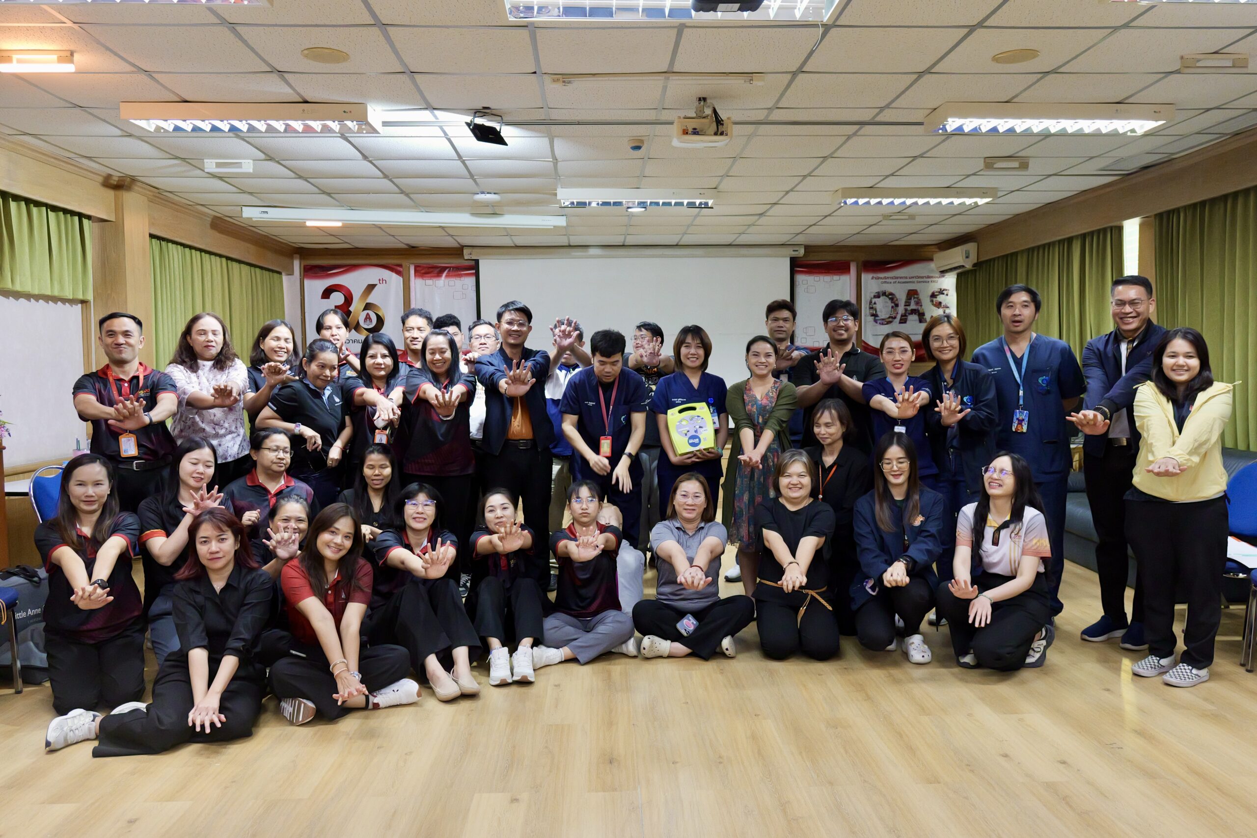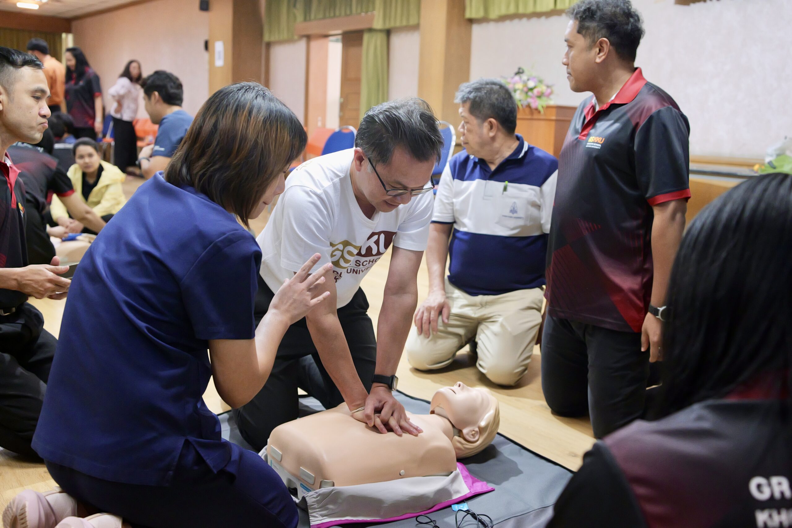 บรรยากาศตลอดการอบรม บุคลากรทั้ง 5 หน่วยงานให้ความสนใจและตั้งใจทดลองใช้อุปกรณ์จริงทั้งการดับเพลิงและการทำ CPR โดยผู้เข้าร่วมโครงการทุกคนต้องผ่านการสอบปฏิบัติในทักษะการช่วยฟื้นคืนชีพขั้นพื้นฐานและการใช้เครื่อง AED เพื่อรับใบรับรอง (Certificate) การผ่านเกณฑ์ประเมินจากวิทยากร นับเป็นการสร้างมาตรฐานความปลอดภัยร่วมกัน และบูรณาการความเข้มแข็งของเครือข่ายหน่วยงานภายในอาคารพิมล กลกิจ ให้เป็นพื้นที่ปลอดภัยสำหรับทั้งบุคลากรและนักศึกษาอย่างแท้จริง