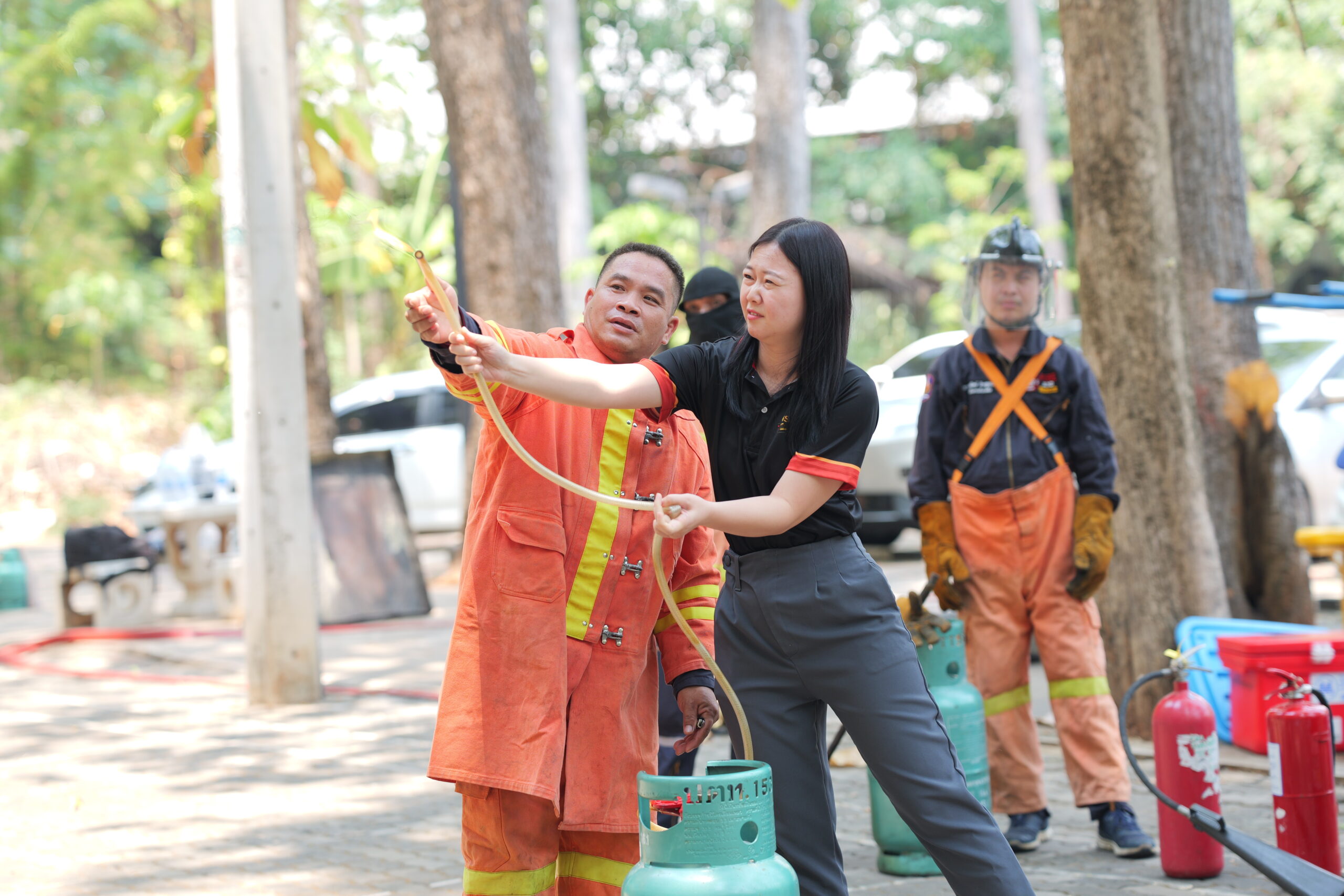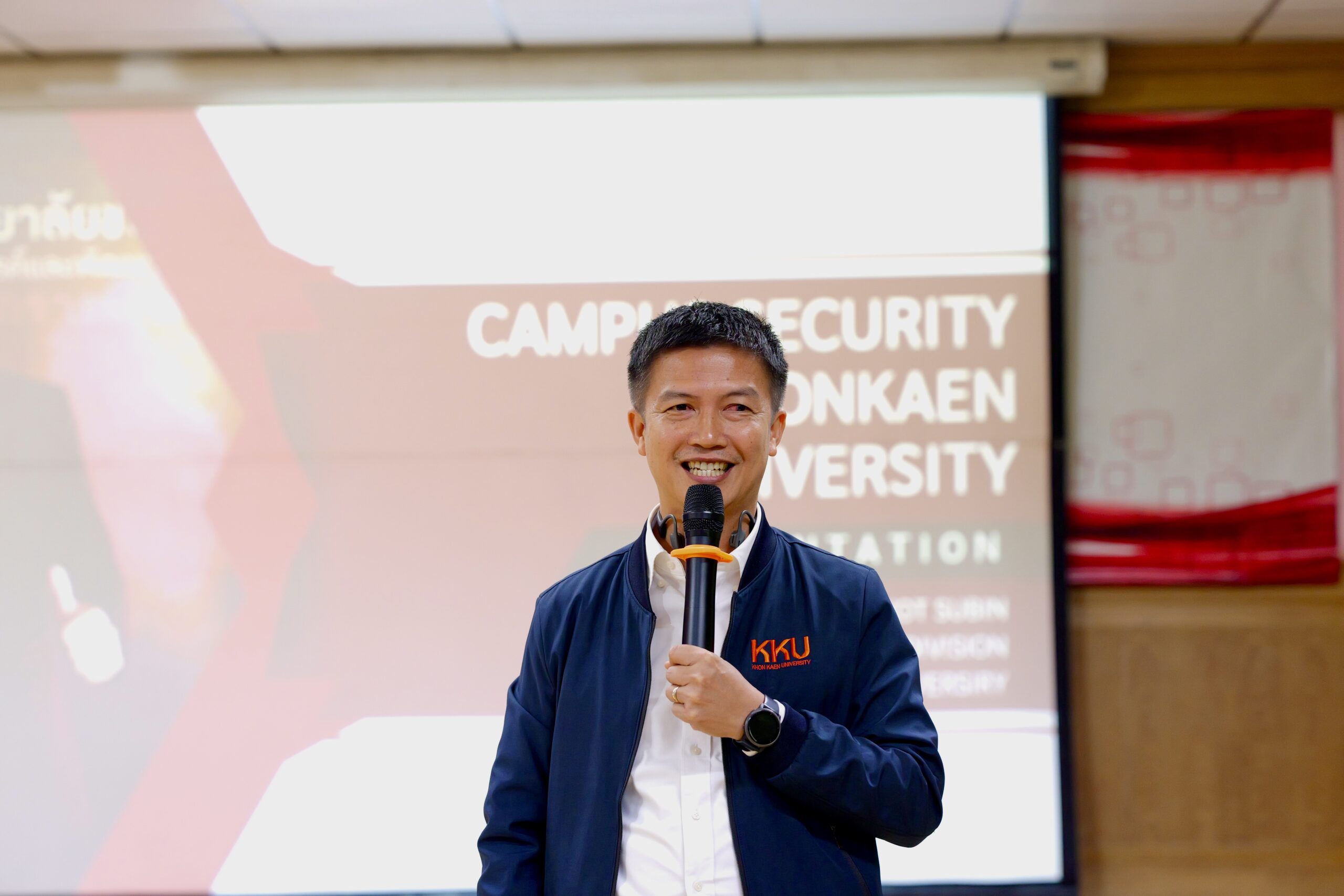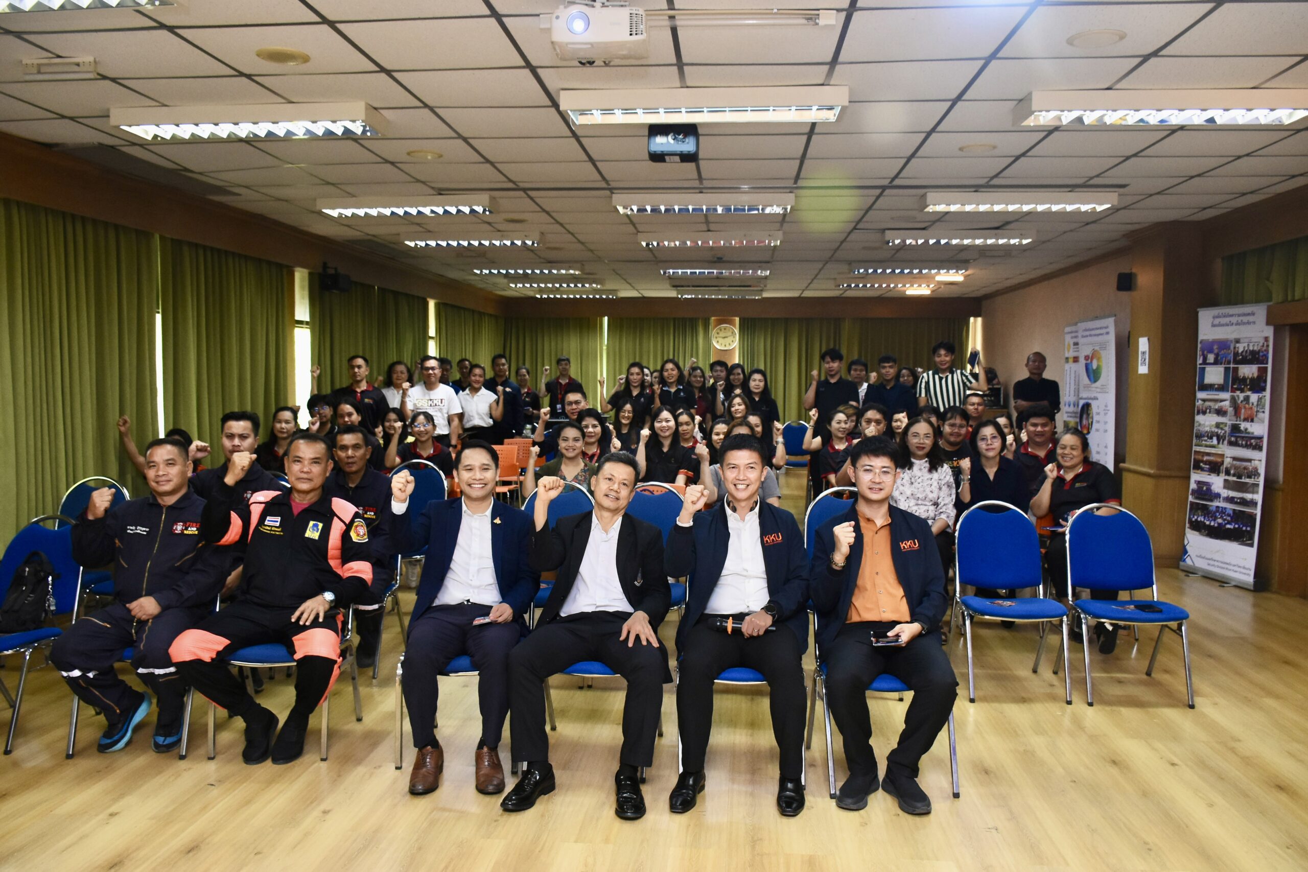 สำหรับการอบรมแบ่งออกเป็น 2 ส่วนสำคัญ โดยในช่วงเช้า เป็นการอบรมด้าน การจัดการความเสี่ยงด้านสาธารณภัย (Disaster Risk Management) ในอาคารสูง และการบัญชาเหตุการณ์ ได้รับเกียรติจาก นายมรกต สุบิน ผู้อำนวยการกองป้องกันและรักษาความปลอดภัย มหาวิทยาลัยขอนแก่น พร้อมทีมวิทยากรผู้เชี่ยวชาญ มาบรรยายให้ความรู้และนำผู้เข้าร่วมฝึกปฏิบัติการจำลองสถานการณ์การระงับอัคคีภัยเบื้องต้น และการฝึกใช้ถังดับเพลิงอย่างถูกวิธี