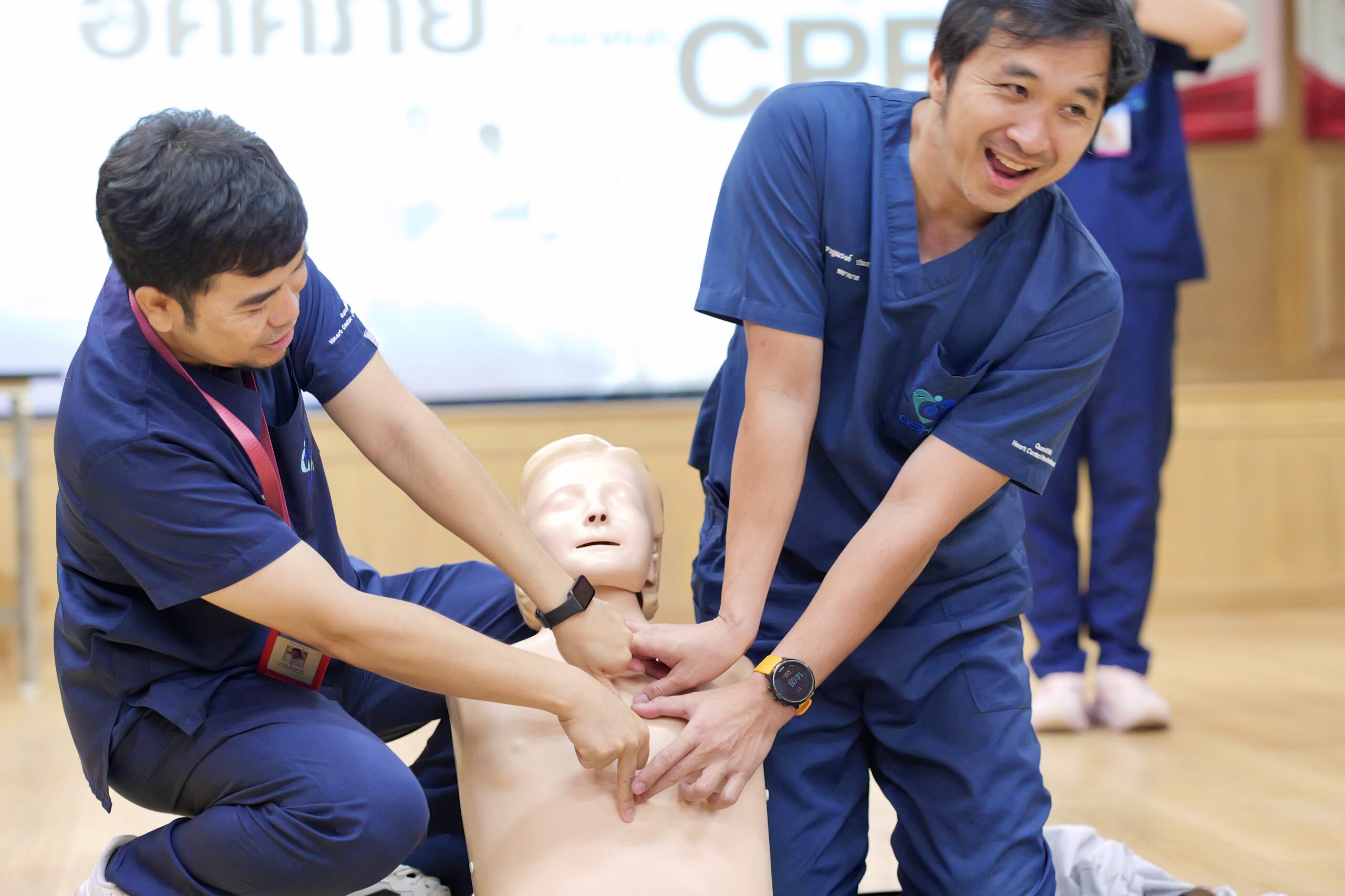 ส่วนในช่วงบ่าย เป็นการอบรมเชิงปฏิบัติการด้าน การช่วยฟื้นคืนชีพขั้นพื้นฐาน (CPR) และการใช้เครื่องกระตุกหัวใจไฟฟ้าชนิดอัตโนมัติ (AED) โดยได้รับความอนุเคราะห์ทีมวิทยากรผู้เชี่ยวชาญจาก ศูนย์หัวใจสิริกิติ์ ภาคตะวันออกเฉียงเหนือ มาตั้งฐานการเรียนรู้ ตั้งแต่การประเมินความปลอดภัยของสิ่งแวดล้อม การประเมินความรู้สึกผู้ป่วย การแจ้งเหตุสายด่วน 1669 ตลอดจนการฝึกปฏิบัติกดหน้าอกอย่างมีประสิทธิภาพสลับกับการใช้เครื่อง AED บนหุ่นจำลอง