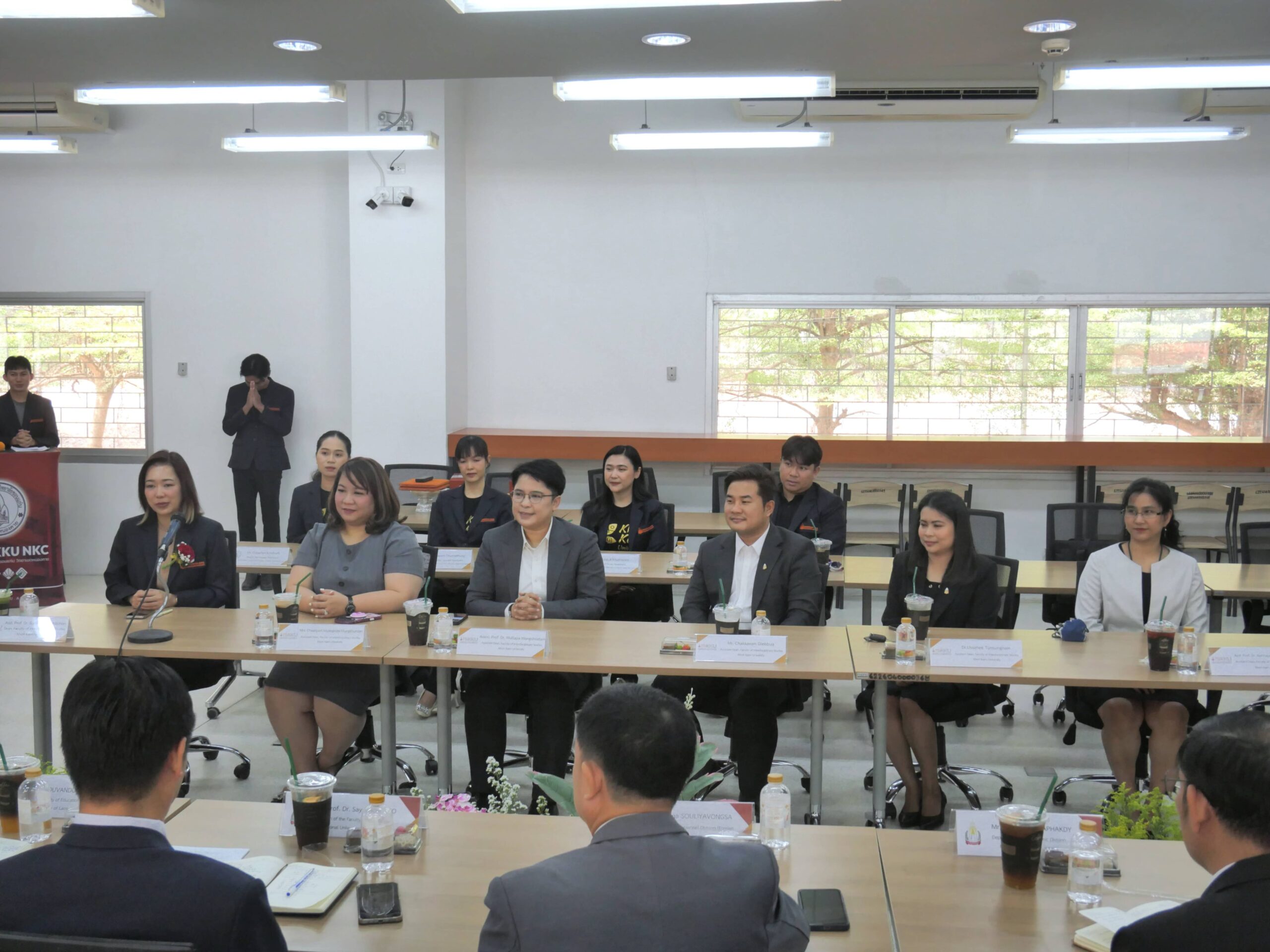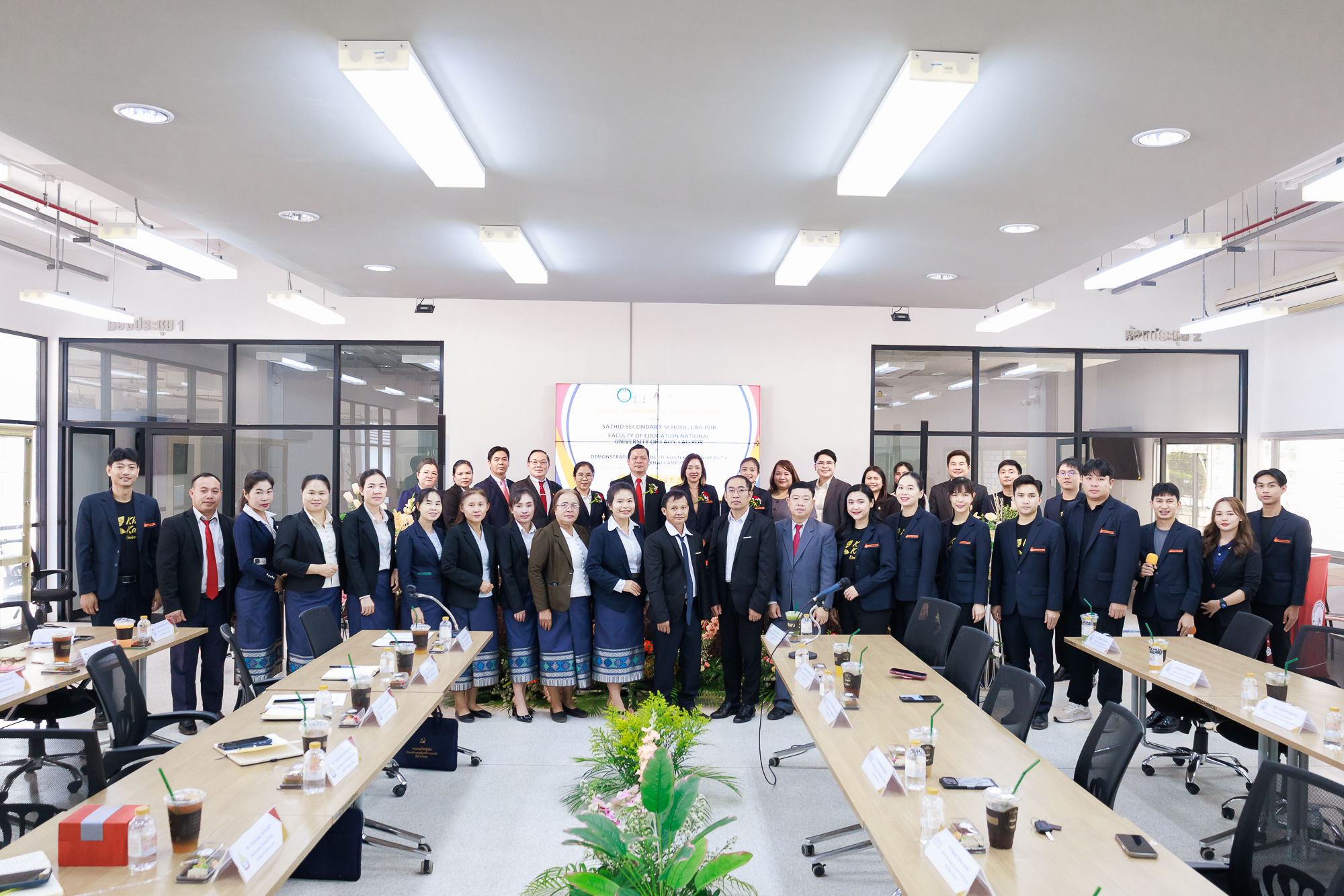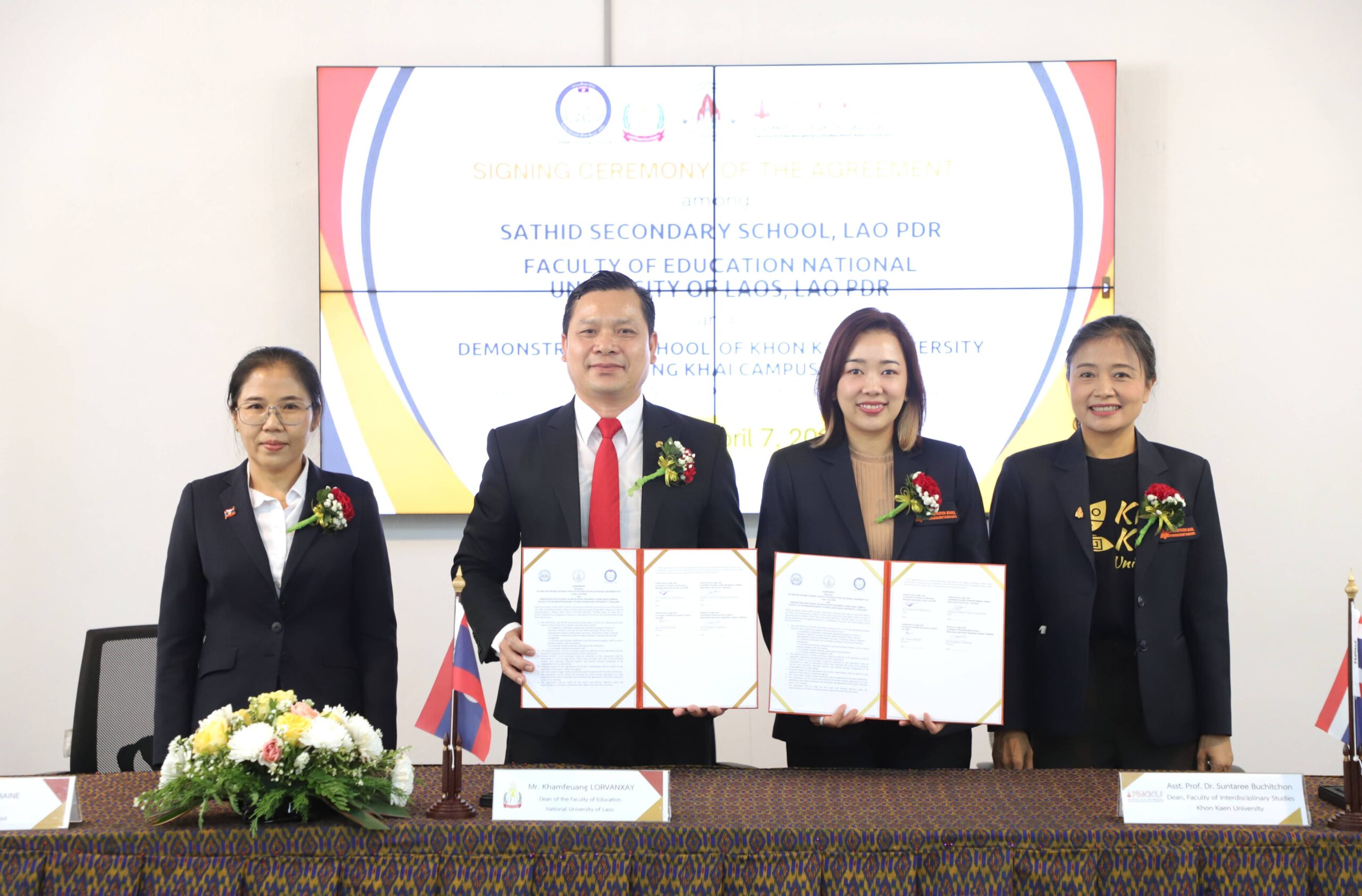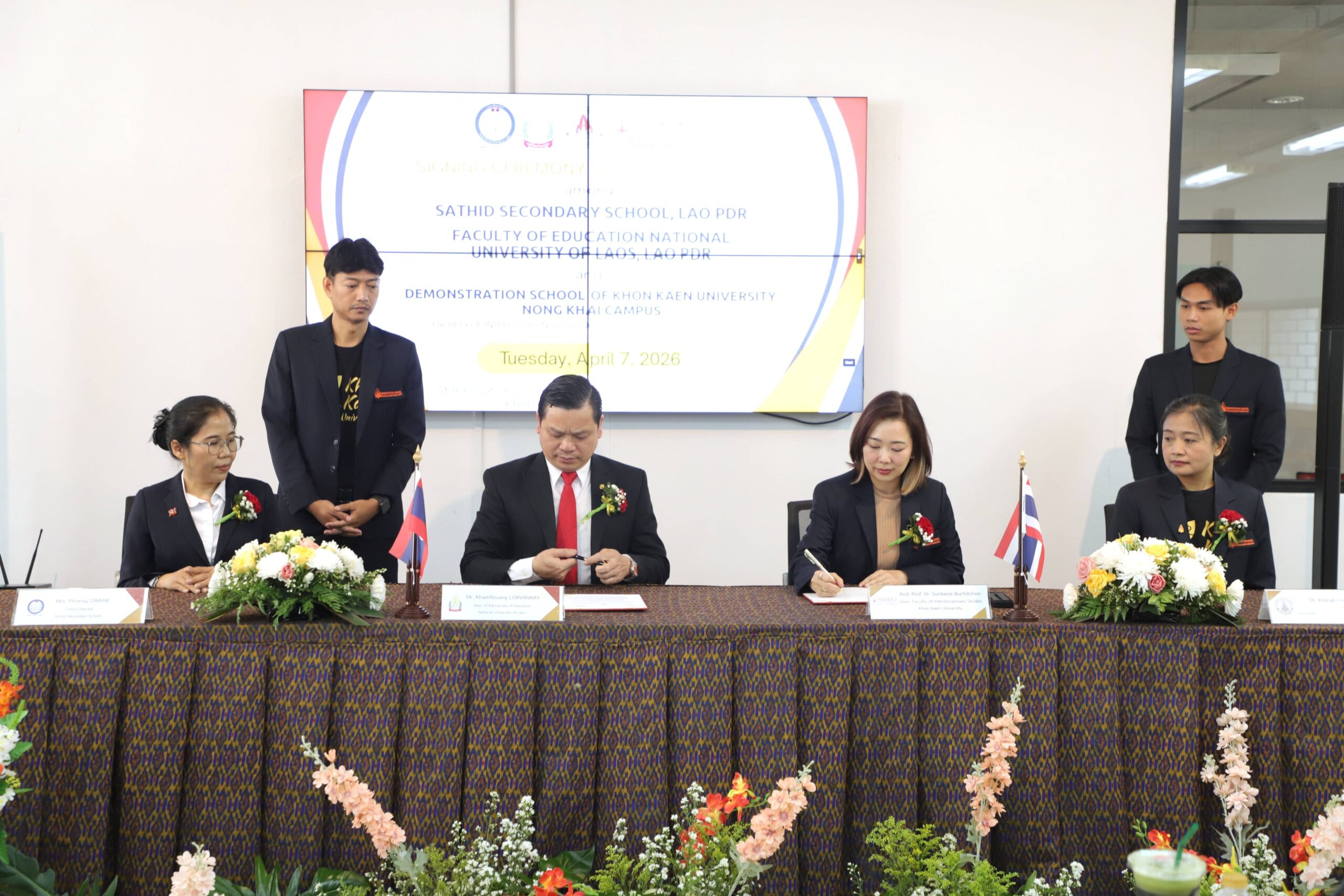 โรงเรียนสาธิตมหาวิทยาลัยขอนแก่น วิทยาเขตหนองคาย จัดโครงการลงนามความร่วมมือทางวิชาการ Academic Cooperation Agreement Signing Ceremony ร่วมกับ โรงเรียนมัธยมสมบูรณ์สาธิต และ คณะศึกษาศาสตร์ มหาวิทยาลัยแห่งชาติลาว การลงนามครั้งนี้ได้รับเกียรติจาก ผู้ช่วยศาสตราจารย์ ดร.สุนทรี บูชิตชน คณบดีคณะสหวิทยาการ มหาวิทยาลัยขอนแก่น และ อาจารย์ ดร.กรองแก้ว กิ่งสวัสดิ์ ผู้อำนวยการโรงเรียนสาธิตมหาวิทยาลัยขอนแก่น วิทยาเขตหนองคาย เป็นผู้ลงนามร่วมกับ Mr. Khamfeuang LORVANXAY คณบดีคณะศึกษาศาสตร์ มหาวิทยาลัยแห่งชาติลาว และ Mrs. Phonsy ORAINE ผู้อำนวยการโรงเรียนมัธยมสมบูรณ์สาธิต มหาวิทยาลัยแห่งชาติลาว พร้อมด้วยคณะผู้บริหาร อาจารย์ และเจ้าหน้าที่จากทั้งสามสถาบันร่วมเป็นสักขีพยานในครั้งนี้ ซึ่งจัดขึ้นในวันอังคารที่ 7 เมษายน 2569 ณ ห้อง Innovation Park ชั้น 1 อาคารเรียนรวมและปฏิบัติการ 2 คณะสหวิทยาการ มหาวิทยาลัยขอนแก่น