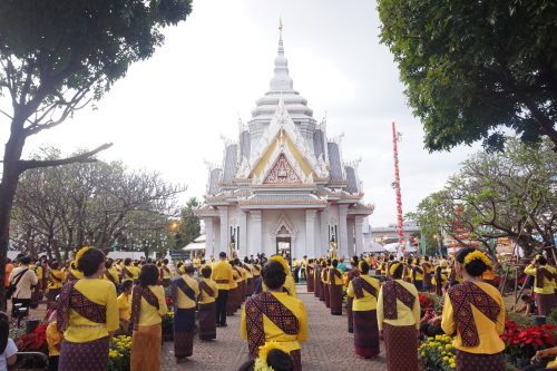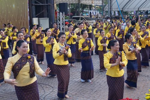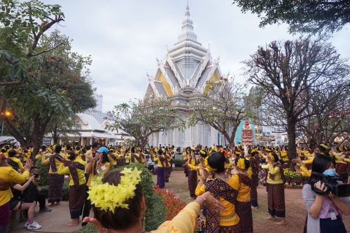 ในส่วนของมหาวิทยาลัยขอนแก่นได้เชิญชวนบุคลากรเป็นตัวแทนเข้าร่วมในกิจกรรมสำคัญครั้งนี้ ซึ่งฝ่ายกิจการพิเศษ โดยกองสื่อสารองค์กร สำนักงานอธิการบดีเป็นผู้ดำเนินงานภายใต้ โครงการเสริมสร้างภาพลักษณ์ มหาวิทยาลัยขอนแก่น เป็นไปตามประเด็นยุทธศาสตร์ มหาวิทยาลัยขอนแก่น ด้าน People : ด้านการส่งมอบคุณค่าแก่ประชาคม และ Spiritual : ด้านการปลูกฝังจิตวิญญาณความเป็นมหาวิทยาลัยขอนแก่น โดย มีวัตถุประสงค์เพื่อสะท้อนบทบาทในการมีส่วนร่วมสืบสานงานศิลปวัฒนธรรม ขนบธรรมเนียมประเพณี และเพื่อเสริมสร้างภาพลักษณ์ของมหาวิทยาลัย ต่อชุมชนและสังคมในวงกว้าง มีผู้บริหาร บุคลากร และนักศึกษา มหาวิทยาลัยขอนแก่น มาร่วมรำจำนวน 200 คน โดยมีการจัดซักซ้อมท่ารำก่อนล่วงหน้า นำซ้อมรำโดยอาจารย์และนักศึกษาคณะศิลปกรรมศาสตร์ ระหว่างวันที่ 23 – 25 พฤศจิกายน 2563 ณ บริเวณ อาคารสิริคุณากร สำนักงานอธิการบดี เพื่อให้เกิดความพร้อมเพรียงและสวยงาม นอกจากนี้ยังได้จัดเตรียมเข็มกลัดดอกคูนเสียงแคน และหน้ากากอนามัยสีเหลืองเพื่อสนับสนุนผลิตภัณฑ์ชุมชน สำหรับผู้ร่วมรำบวงสรวงตามที่จังหวัดขอนแก่นได้กำหนดไว้ พร้อมทั้งรถบริการ รับ ส่ง ผู้ร่วมงานทุกคน