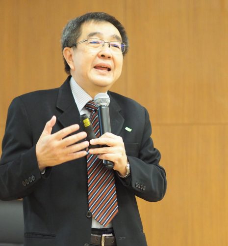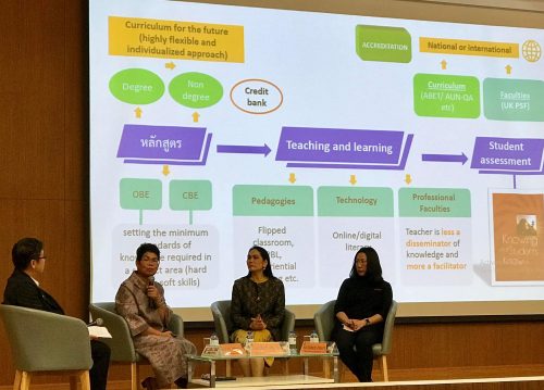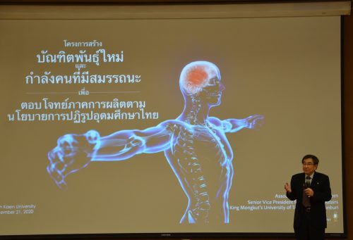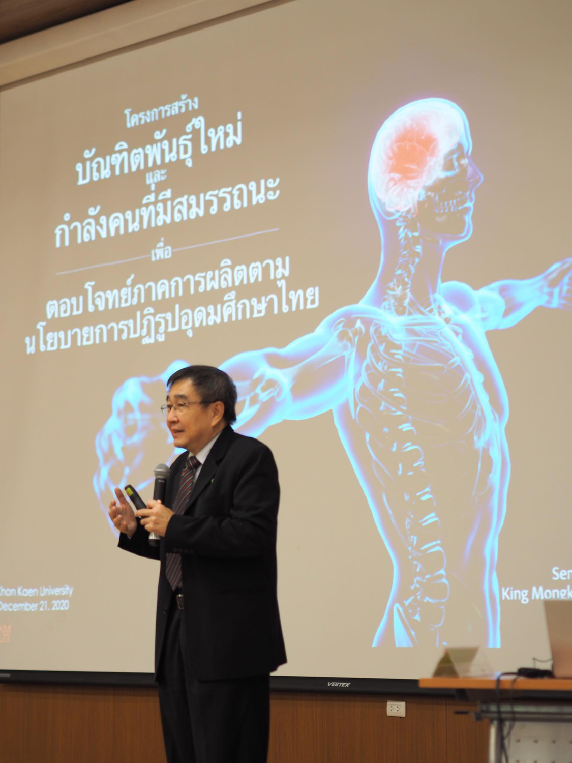 จากนั้นเป็นการบรรยายของ รองศาสตราจารย์ ดร.บัณฑิต ทิพากร รองอธิการบดีอาวุโสฝ่ายวิชาการ มหาวิทยาลัยเทคโนโลยีพระจอมเกล้าธนบุรี เรื่อง การพัฒนาหลักสูตรตามกระบวนทัศน์ใหม่ในโครงการผลิตบัณฑิตพันธุ์ใหม่ ซึ่งเน้นให้เห็นถึงความสำคัญและจำเป็นอย่างยิ่งที่หลักสูตรต้องปรับตัวและเปลี่ยนแปลงให้สอดคล้องกับความต้องการภาคอุตสาหกรรมและผู้ใช้บัณฑิต โดยการเปลี่ยนแปลงที่สำคัญคือผลลัพธ์ที่เกิดขึ้นกับบัณฑิต ต้องเป็นทักษะและสมรรถนะที่หลักสูตรสร้างให้เกิดขึ้นกับบัณฑิต แทนการวัดประเมินรูปแบบเดิม ตลอดจนการพัฒนาสู่การเรียนรู้ตลอดชีวิต การจัดชุดวิชาหรือกลุ่มวิชาที่ตอบสนองต่อการพัฒนาทักษะที่ผู้เรียนนำไปใช้ทำงานได้ ซึ่งโครงการบัณฑิตพันธุ์ใหม่เป็นรูปแบบการให้งบประมาณสนับสนุนการดำเนินการเพื่อสร้างกำลังคนให้ตอบโจทย์อุตสาหกรรมของประเทศ และเป็นอีกหนึ่งช่องทางที่สอดคล้องไปกับการพัฒนาหลักสูตรตามกระบวนทัศน์ใหม่ของมหาวิทยาลัยขอนแก่น ซึ่งแต่ละหลักสูตรสามารถออกแบบและพัฒนาหลักสูตร การจัดการเรียนการสอน การวัดประเมินผลให้สอดคล้องกับบริบทของหลักสูตรและผลลัพธ์ที่เกิดกับผู้เรียนได้ตามเป้าหมายของแต่ละหลักสูตร ให้สอดคล้องกับแนวทางที่โครงการบัณฑิตพันธุ์ใหม่ต้องการ คือ หลักสูตรสามารถสร้างผลลัพธ์การเรียนรู้ให้เกิดกับนักศึกษาในเชิงการใช้ปัญญาเพื่อการเรียนรู้และบัณฑิตสามารถทำงานในสิ่งที่ไม่เห็นมาก่อน