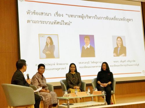 และปิดท้ายในช่วงเช้าของกิจกรรม เป็นการเสวนา หัวข้อ บทบาทของผู้บริหารในการสนับสนุนการพัฒนาหลักสูตรตามกระบวนทัศน์ใหม่ โดย ศาสตราจารย์ ดร. กัลปพฤกษ์ ผิวทองงาม คณบดีคณะเศรษฐศาสตร์ รองศาสตรจารย์ ดร.ดรุณี โชติษฐยางกูร คณบดีคณะเกษตรศาสตร์ และรองศาสตราจารย์ ดร. เพ็ญศรี เจริญวานิช คณบดีคณะบริหารธุรกิจและการบัญชี ซึ่งสามารถขับเคลื่อนหลักสูตรตามกระบวนทัศน์ใหม่ให้เกิดขึ้นในคณะ ผ่านการกำหนดวิสัยทัศน์และเป้าหมายที่ชัดเจน การนำองค์กรอย่างทุ่มเทและจริงจัง เพื่อให้สามารถเปลี่ยนแปลงและก้าวข้ามสิ่งที่ท้าทายในมิติต่าง ๆ ของการจัดการศึกษาภายในองค์กร โดยมีเป้าหมายเพื่อส่งมอบคุณค่าให้กับนักศึกษาและบัณฑิต