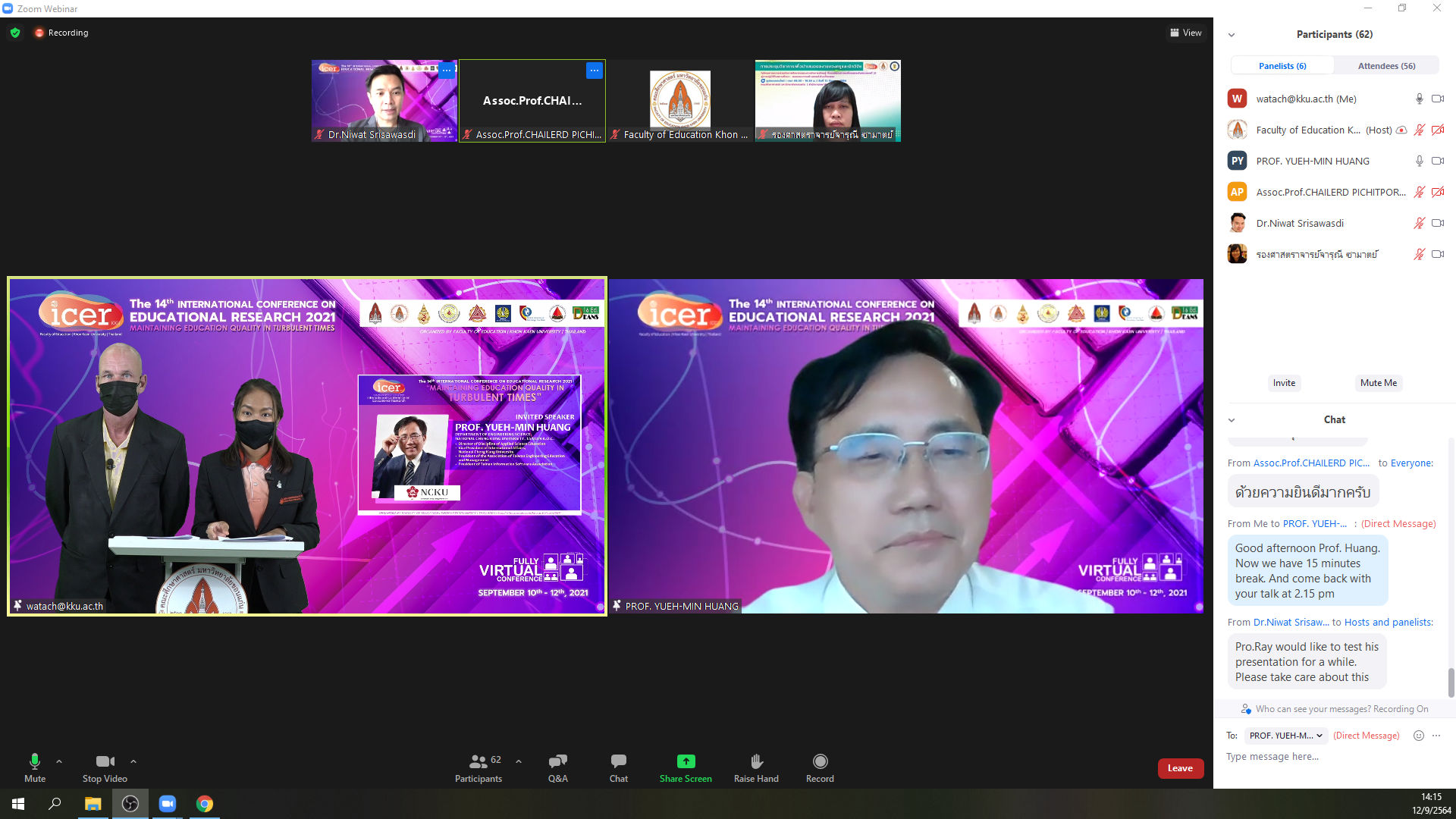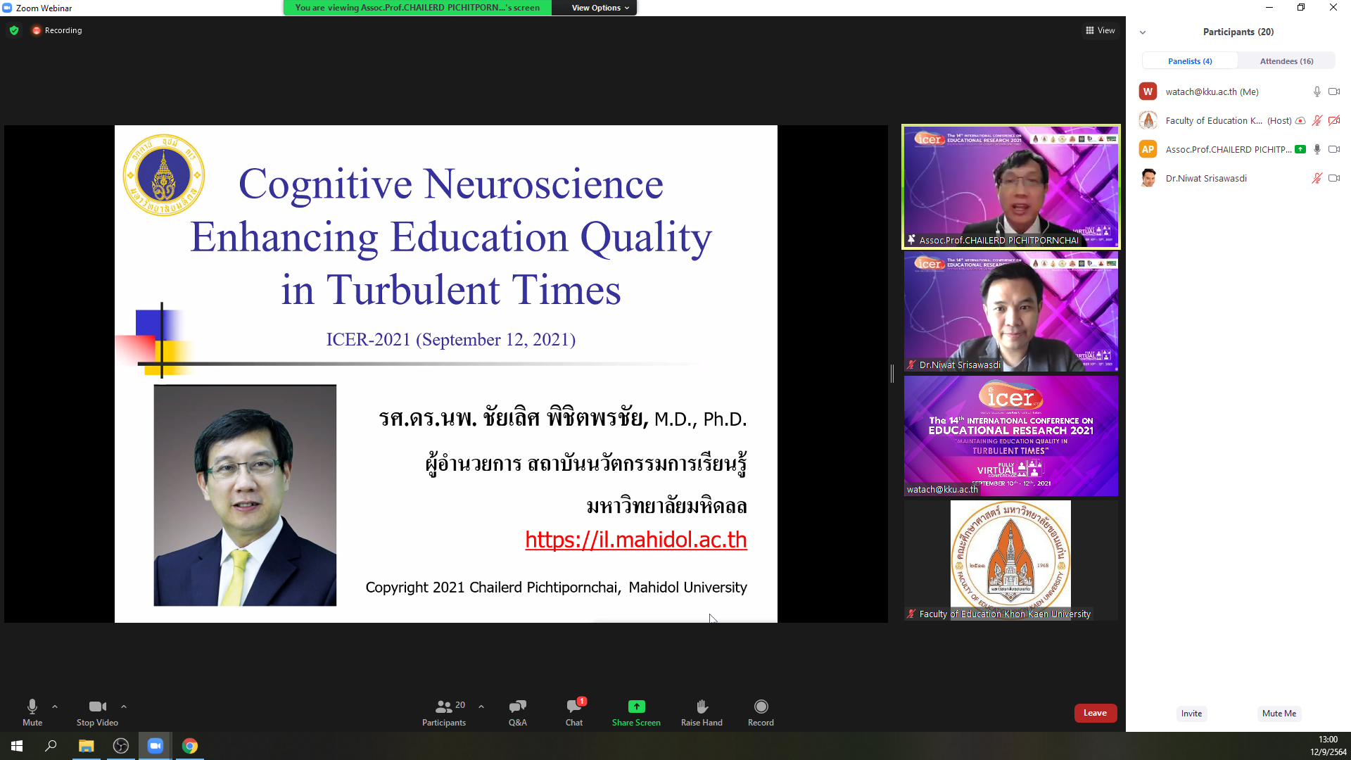 คณะศึกษาศาสตร์ มหาวิทยาลัยขอนแก่น จัดประชุมวิชาการนานาชาติ ในรูปแบบออนไลน์ The 14th International Conference on Educational Research 2021 หรือ ICER 2021 ภายใต้หัวข้อ “Maintaining Education Quality in Turbulent Times” จัดขึ้นระหว่างวันที่ 10-12 กันยายน 2564 ในรูปแบบออนไลน์ ซึ่งเป็นพื้นที่การนำเสนอผลงานของนักการศึกษาจากหลายประเทศรวมแลกเปลี่ยนองค์ความรู้ใหม่ภายใต้สถานะโควิด-19 ที่เป็นตัวแปลเร่งให้เกิดการเปลี่ยนแปลงสู่วิถีชีวิตใหม่ โดยได้รับเกียรติจาก รศ. นพ.ชาญชัย พานทองวิริยะกุล อธิการบดีมหาวิทยาลัยขอนแก่น เป็นประธานในพิธีเปิด รศ. ดร.สุมาลี ชัยเจริญ คณบดีคณะศึกษาศาสตร์ เป็นประธานกล่าวรายงานการจัดประชุมวิชาการฯ และ ได้รับเกียรติจาก รศ. ดร.ชยาพร วัฒนศิริ อธิการบดีมหาวิทยาลัยแม่ฟ้าหลวง และ รศ. ดรภัทราวดี มากมี คณบดีวิทยาลัยวิทยาการวิจัยและวิทยาการปัญญา มหาวิทยาลัยบูรพา ร่วมกล่าวต้อนรับผู้เข้าร่วมการประชุมวิชาการฯ