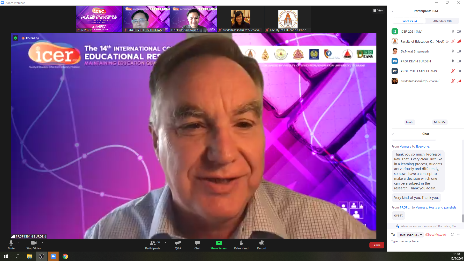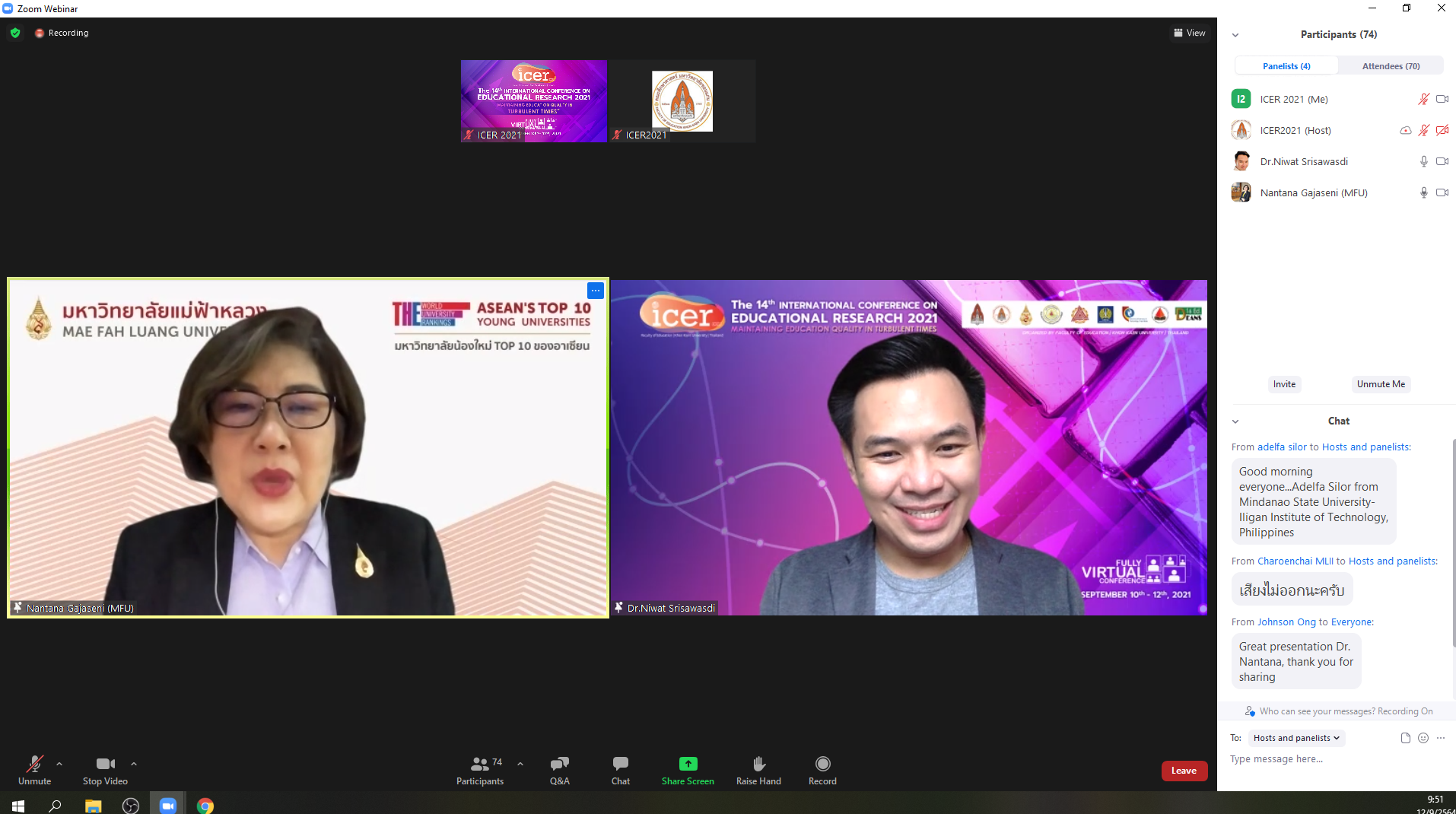 รศ. ดร.สุมาลี ชัยเจริญ คณบดีคณะศึกษาศาสตร์ กล่าวว่า “การประชุมวิชาการนานาชาติ ICER 2021 นั้นจัดขึ้นเปิดโอกาสให้นักการศึกษานานาชาติได้แลกเปลี่ยนเรียนรู้และสร้างเครือข่ายการทำงานร่วมกันเพื่อพร้อมรับความท้าทายทางการศึกษาสำหรับการเปลี่ยนแปลงในอนาคตทั้งนี้ มีผู้เข้าร่วมนำเสนอผลงานโดยการนำเสนอปากเปล่า 101 ผลงาน นอกจากนี้ ยังมีผู้ให้ความสนใจเข้าร่วมงานเพื่อรับฟังและร่วมชมการนำเสนออีกมากกว่า 300 คน รวมถึง ผู้เชี่ยวชาญที่มีความเชี่ยวชาญเฉพาะที่แตกต่างกันร่วมแลกเปลี่ยนประสบการณ์และแนวคิดทางการศึกษาในสาขาวิชาของตน ตลอดระยะเวลาของการประชุมวิชาการฯ”