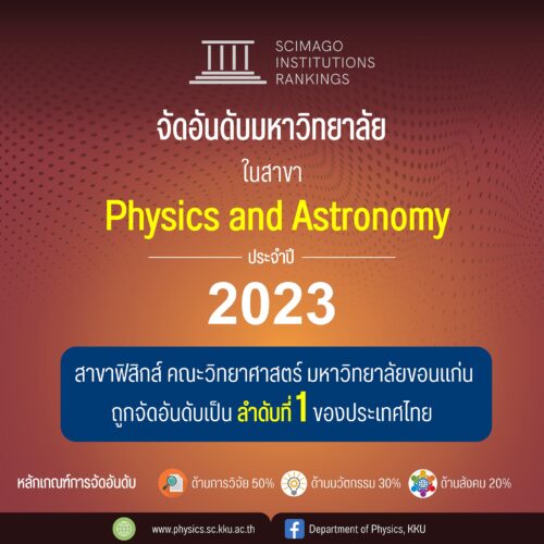 สาขาฟิสิกส์ คณะวิทย์ฯ ม.ขอนแก่น ได้รับการจัดอันดับเป็นลำดับที่ 1 ของประเทศไทยในสาขา Physics and Astronomy ประจำปี 2023 โดย SCImago Institutions Rankings (SIR) 2023 11/04/2023 15:35 น.