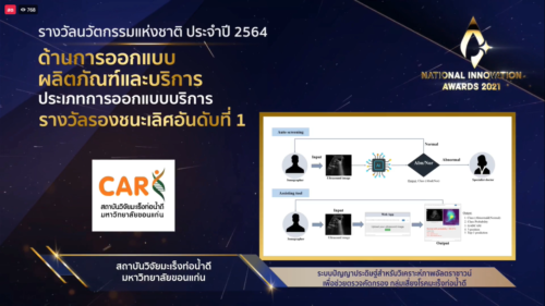 ทีมวิจัย AI ภายใต้สถาบันวิจัยมะเร็งท่อน้ำดี คว้ารางวัลรองชนะเลิศอันดับ 1 ด้านการออกแบบผลิตภัณฑ์และบริการ งานวันนวัตกรรมแห่งชาติปี 2564 06/10/2021 13:28 น.