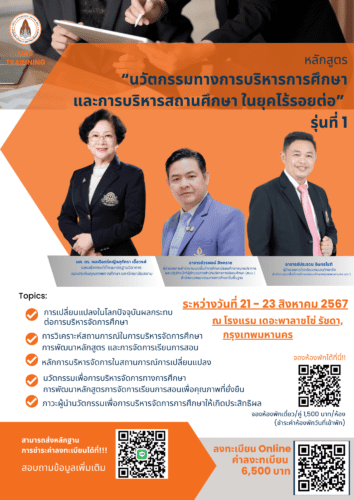 เปิดรับแล้ว ! หลักสูตร “นวัตกรรมทางการบริหารการศึกษาและการบริหารสถานศึกษาในยุคไร้รอยต่อ” รุ่นที่ 1 สำหรับนักบริหารการศึกษา ผู้บริหารสถานศึกษา และ ผู้ที่กำลังก้าวสู่เส้นทางนักบริหาร 31/05/2024 13:38 น.