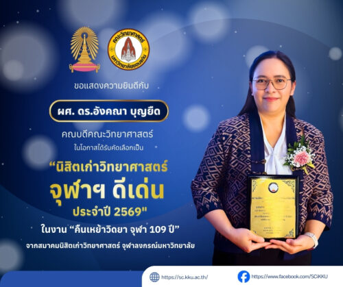 ผศ.ดร.อังคณา บุญยืด คณบดีคณะวิทยาศาสตร์ มข. ได้รับเลือกเป็นนิสิตเก่าวิทยาศาสตร์ จุฬาฯ ดีเด่น ประจำปี 2569 25/02/2026 13:35 น.