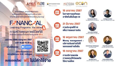 ขอเชิญเข้าร่วมอบรม Financial Learning Programs the series : session 4 การสร้างคุณภาพชีวิตที่ดีด้วยการวางแผนการเงินอย่างชาญฉลาด ปีที่ 4 01/12/2023 14:43 น.