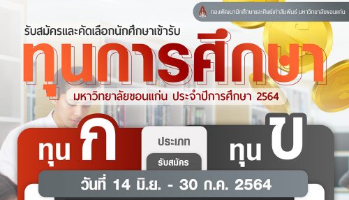 ด่วน! มหาวิทยาลัยขอนแก่น (จัดสรรทุนส่วนกลาง) ปีการศึกษา 2564 จำนวนกว่า 45 ล้านบาท เปิดรับสมัคร 14 มิ.ย. – 30 ก.ค. 64 17/06/2021 12:00 น.