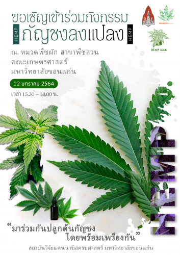 วันนี้>>>ขอเชิญชวนท่านร่วมกิจกรรมปลูกกัญชงลงแปลง ณ หมวดพืชผัก สาขาพืชสวน คณะเกษตรศาสตร์ 12/01/2021 10:03 น.
