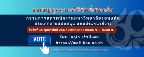 29 กุมภาพันธ์ นี้ขอเชิญบุคลากรใช้สิทธิ์เลือกตั้ง กรรมการสภาพนักงาน มหาวิทยาลัยขอนแก่น ประเภทสาย สนับสนุน 12/02/2024 13:08 น.