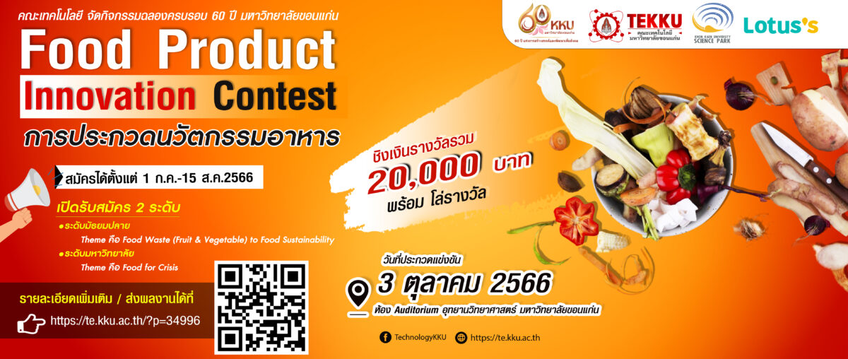คณะเทคโนโลยี มข. จัดกิจกรรมฉลองครบรอบ 60 ปี ของมหาวิทยาลัยขอนแก่น ขอเชิญนักเรียน นักศึกษา ผู้สนใจเข้าร่วมประกวดโครงการ Food Product Innovation Contest “การประกวดนวัตกรรมอาหาร” ชิงเงินรางวัลรวม 20,000 บาท พร้อมโล่รางวัล