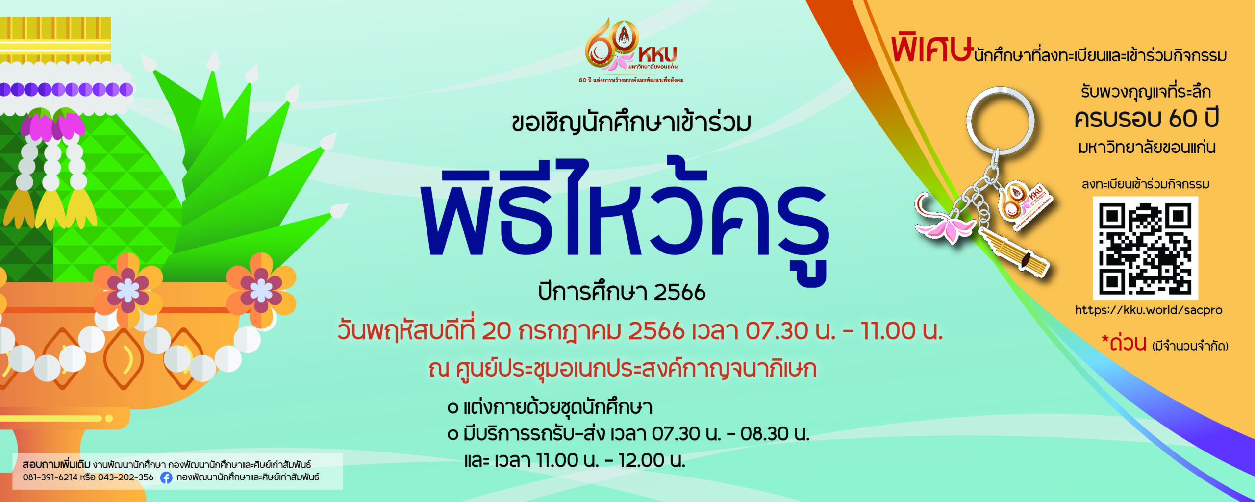 ขอเชิญร่วมพิธีไหว้ครู วันพฤหัสบดีที่ 20 กรกฏาคม 2566 เวลา 07.30-11.00 น. ณ ศูนย์ประชุมอเนกประสงค์กาญจนาภิเษก มหาวิทยาลัยขอนแก่น