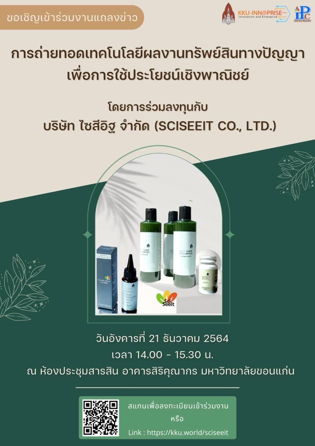 งานแถลงข่าว การถ่ายทอดเทคโนโลยีผลงานทรัพย์สินทางปัญญามหาวิทยาลัยขอนแก่นเพื่อการใช้ประโยชน์เชิงพาณิชย์ โดยการร่วมลงทุนระหว่างมหาวิทยาลัยขอนแก่น กับ บริษัท ไซสีอิฐ จำกัด (SCISEEIT CO., LTD.) ในวันอังคารที่ 21 ธันวาคม 2564 เวลา 14.00–15.30 น. ณ ห้องประชุมสารสิน อาคารสิริคุณากร มหาวิทยาลัยขอนแก่น