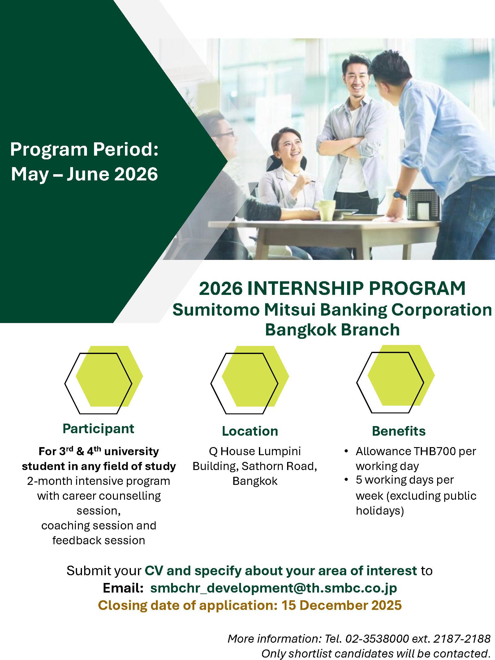 ธนาคารซูมิโตโม มิตซุย แบงกิ้ง คอร์ปอเรชั่น รับสมัครนักศึกษาในระดับปริญญาตรีเข้าร่วมโครงการ Internship Program ระหว่างเดือนพฤษภาคม – มิถุนายน 2569 โดยนักศึกษาที่ได้รับคัดเลือกเข้าโครงการจะได้รับเบี้ยเลี้ยงวันละ 700 บาทต่อวันทำการของธนาคารฯ รวมถึงเข้าร่วมโปรแกรมการเรียนรู้การฝึกงานที่ออกแบบโดยเฉพาะให้เหมาะสมกับนักศึกษา และการร่วมหารือในการทำงานกับผู้จัดการและผู้บริหารของธนาคารฯ นักศึกษาที่สนใจเข้าร่วมโครงการสามารถส่งประวัติ (Resume) และรายละเอียดตำแหน่งงานที่สนใจฝึกปฎิบัติงานไปยัง email: smbchr_development@th.smbc.co.jp ภายในวันอาทิตย์ที่ 15 ธันวาคม พ.ศ. 2568